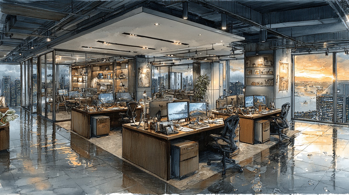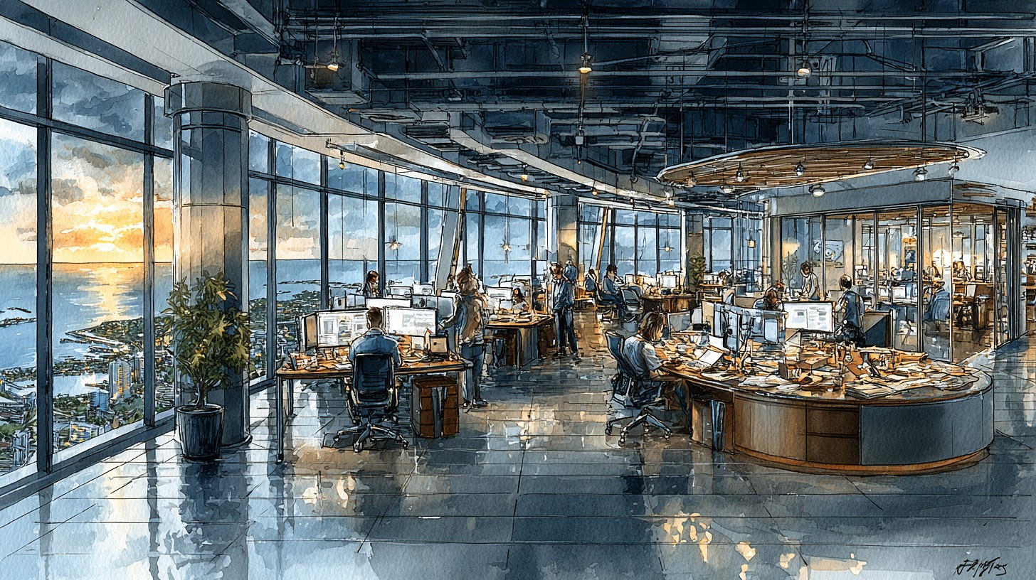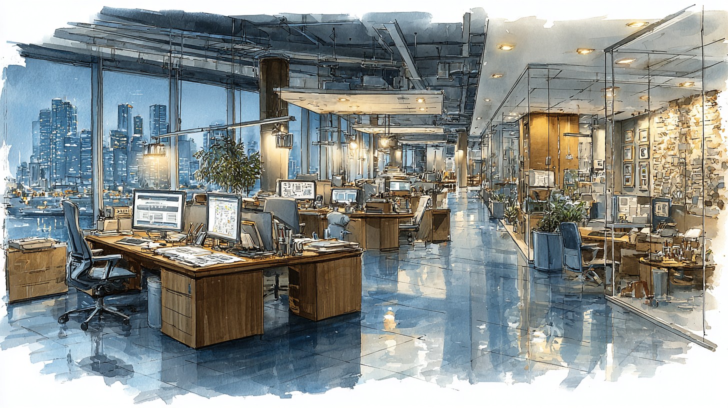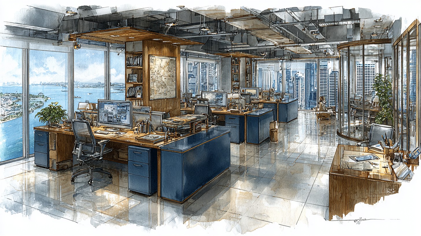watercolor painting in high contrast style, modern open-plan office in a high-rise building in downtown Singapore, workstations and meeting rooms, large windows revealing sunset ocean view over the city marina, glossy desk reflections, sharp subject separation with prominent negative space for text overlay, neon cyan rim lighting, deep navy background, minimal palette dominated by ink blue neon cyan and subtle gold accents, cinematic composition, ultra detailed, intricate ink washes, –ar 16:9 –raw –s 250 –v 7.0 –p lh4so59