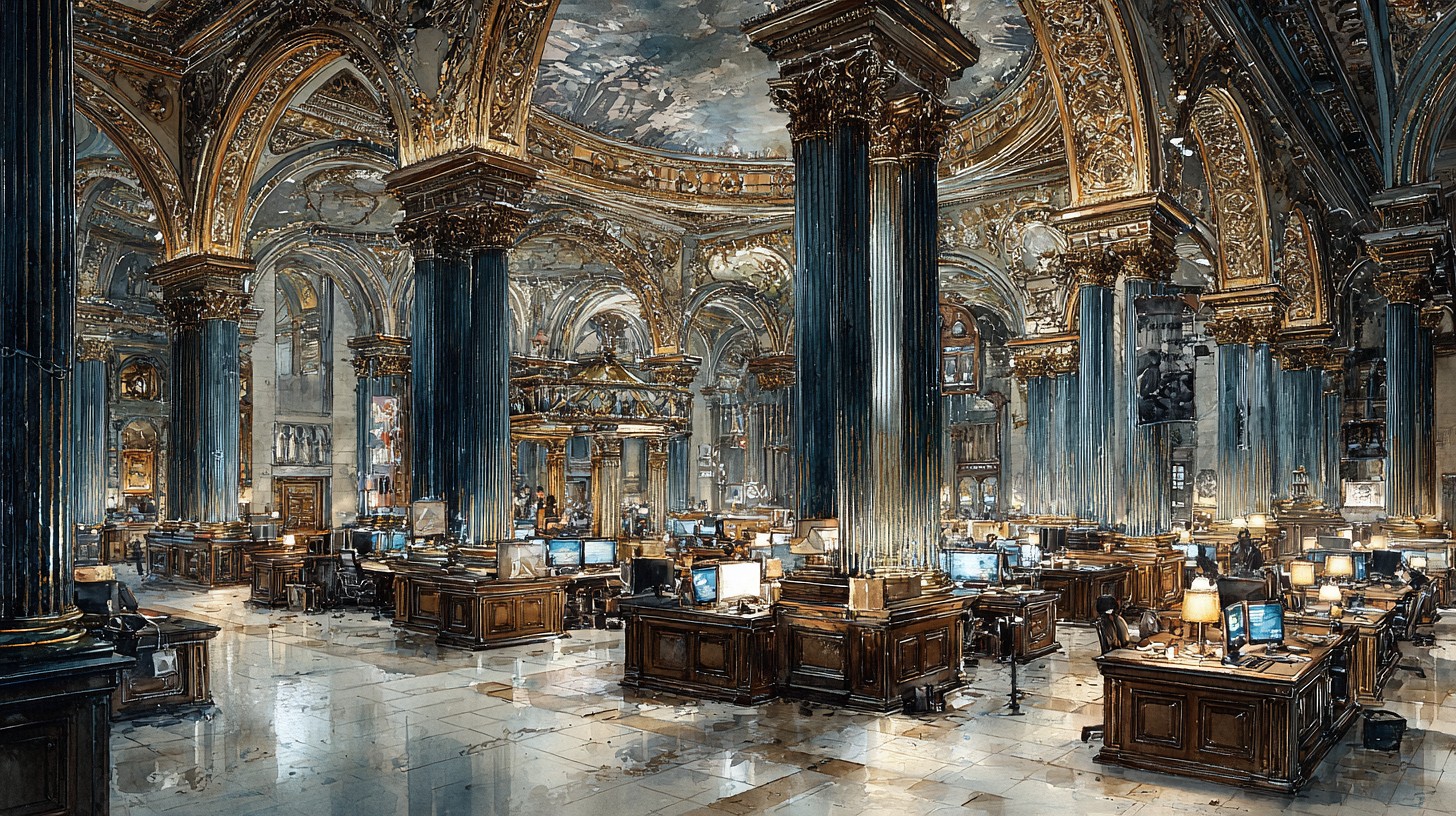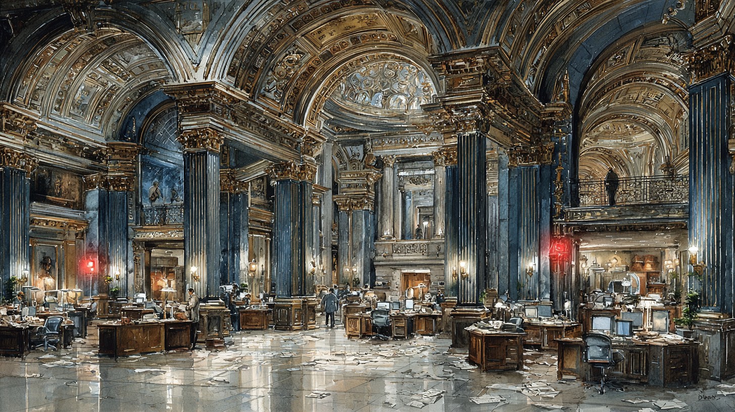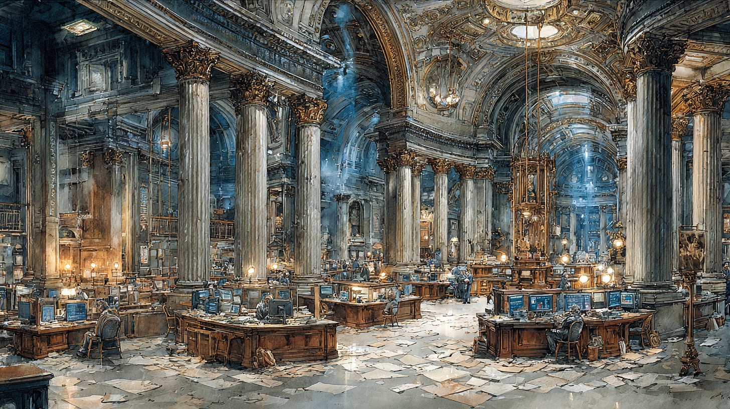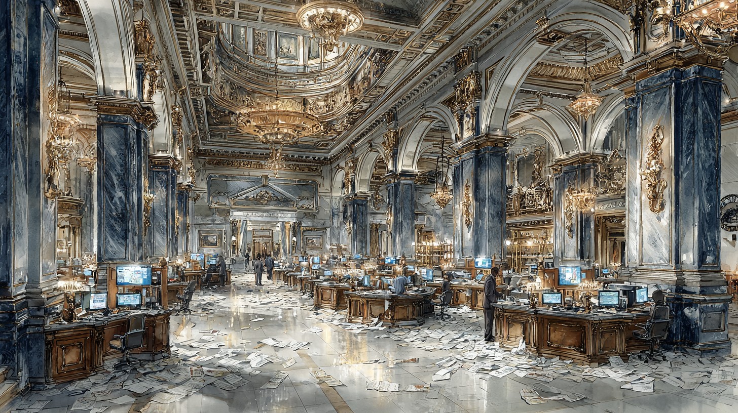 prompt: high-contrast watercolor painting, grand opulent stock exchange trading hall in final frenzy before collapse, ornate gilded architecture with towering marble columns and intricate ceiling frescoes, scattered papers swirling in chaos, abandoned trading desks with flickering screens, glossy reflections on polished floors, neon cyan rimlight, deep navy background, cinematic composition, sharp subject separation with extremely legible negative space for text, minimal palette of ink blue neon cyan and gold accents, ultra-detailed, intricate textures, dramatic atmosphere,faint red emergency lights,soft blended edges, translucent washes, –ar 16:9 –raw –s 250 –v 7.0 –p lh4so59