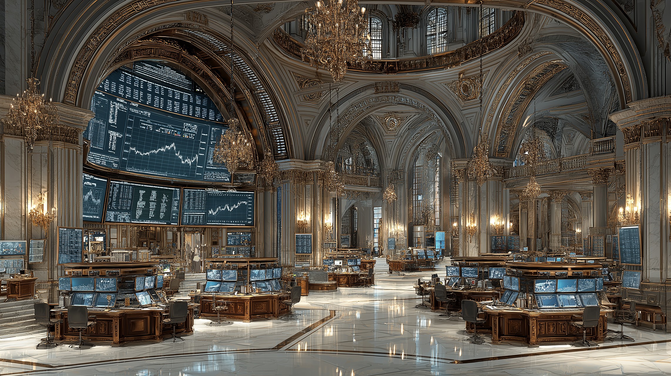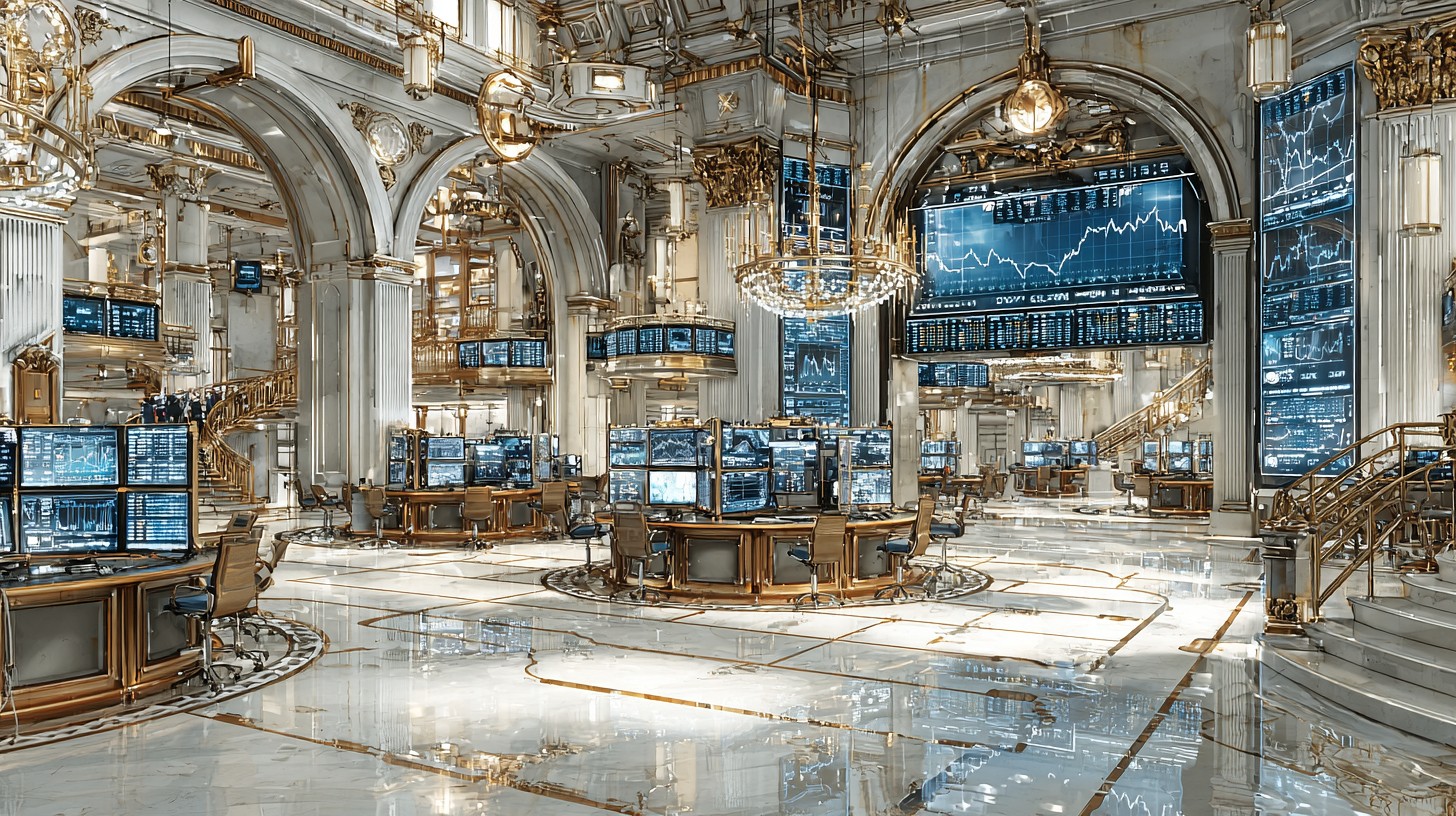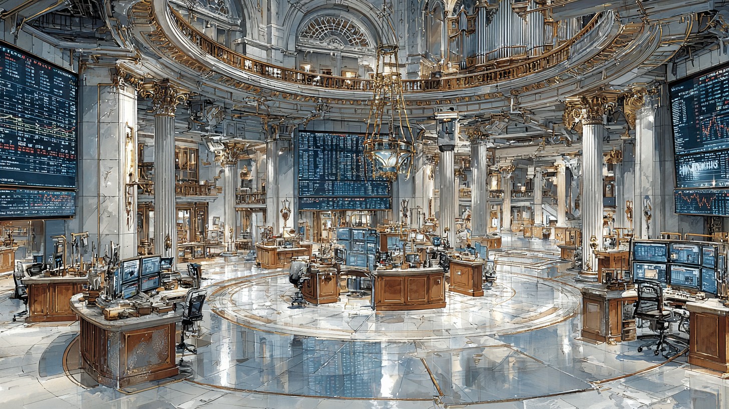 prompt: high-contrast watercolor painting, grand opulent stock exchange trading hall in final frenzy before collapse, ornate gilded architecture with towering marble columns and intricate ceiling frescoes, scattered papers swirling in chaos, abandoned trading desks with flickering screens, glossy reflections on polished floors, neon cyan rimlight, deep navy background, cinematic composition, sharp subject separation with extremely legible negative space for text, minimal palette of ink blue neon cyan and gold accents, ultra-detailed, intricate textures, dramatic atmosphere,faint red emergency lights,soft blended edges, translucent washes, –ar 16:9 –raw –s 250 –v 7.0 –p lh4so59