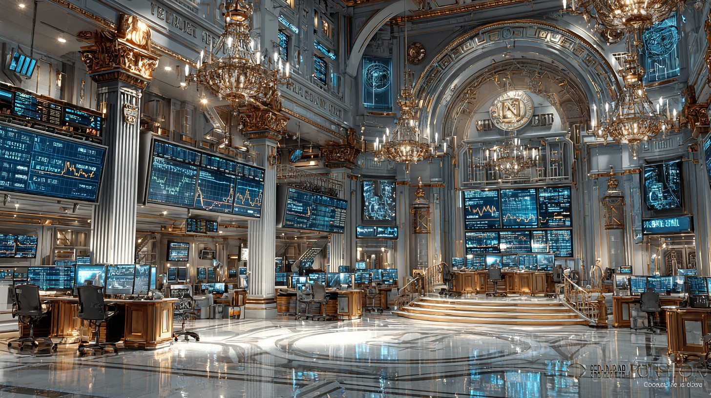 Prompt:high-contrast watercolor illustration, grand opulent New York Stock Exchange trading floor in final manic frenzy before collapse, empty of people, massive electronic display screens surrounding each abandoned trading station, towering wall-mounted screens showing plummeting stock prices and chaotic trend curves, flickering red warning indicators on screens, glossy reflections on polished marble floors, neon cyan rimlight, deep navy background, cinematic composition with sharp subject separation, dramatic negative space for legible text overlay, minimal palette of ink blue neon cyan and gold accents,ornate gilded architectural details, crystal chandeliers –ar 16:9 –raw –stylize 750 –v 7.0 –p lh4so59