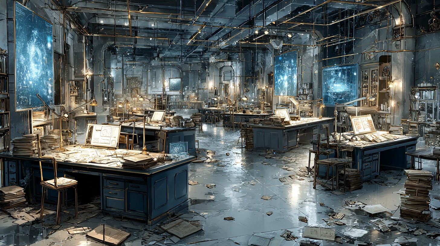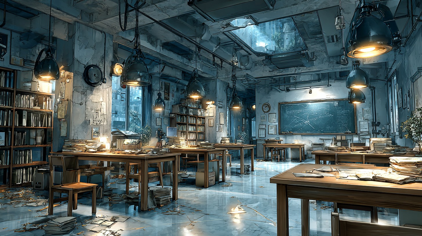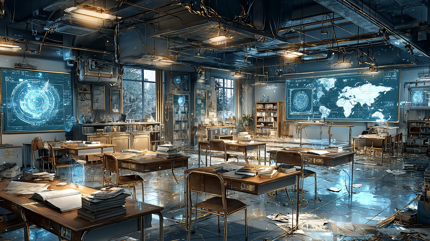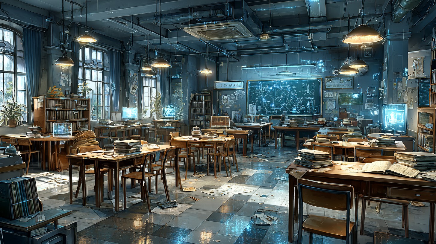 Prompt:watercolor illustration, abandoned classroom long unused and completely replaced by AI, empty desks covered in dust, scattered old books and papers, broken holographic projectors, faint glowing AI interfaces lingering in the air, soft diffused contrast, neon cyan rimlight, deep navy background, cinematic composition, sharp subject separation, glossy reflections on dusty surfaces, minimal palette with ink blue tones neon cyan glow and subtle gold accents, extremely legible negative space, ultra-detailed, intricate linework,silent and desolate atmosphere,vast empty floor space in foreground, –ar 16:9 –raw –s 250 –v 7.0 –p lh4so59