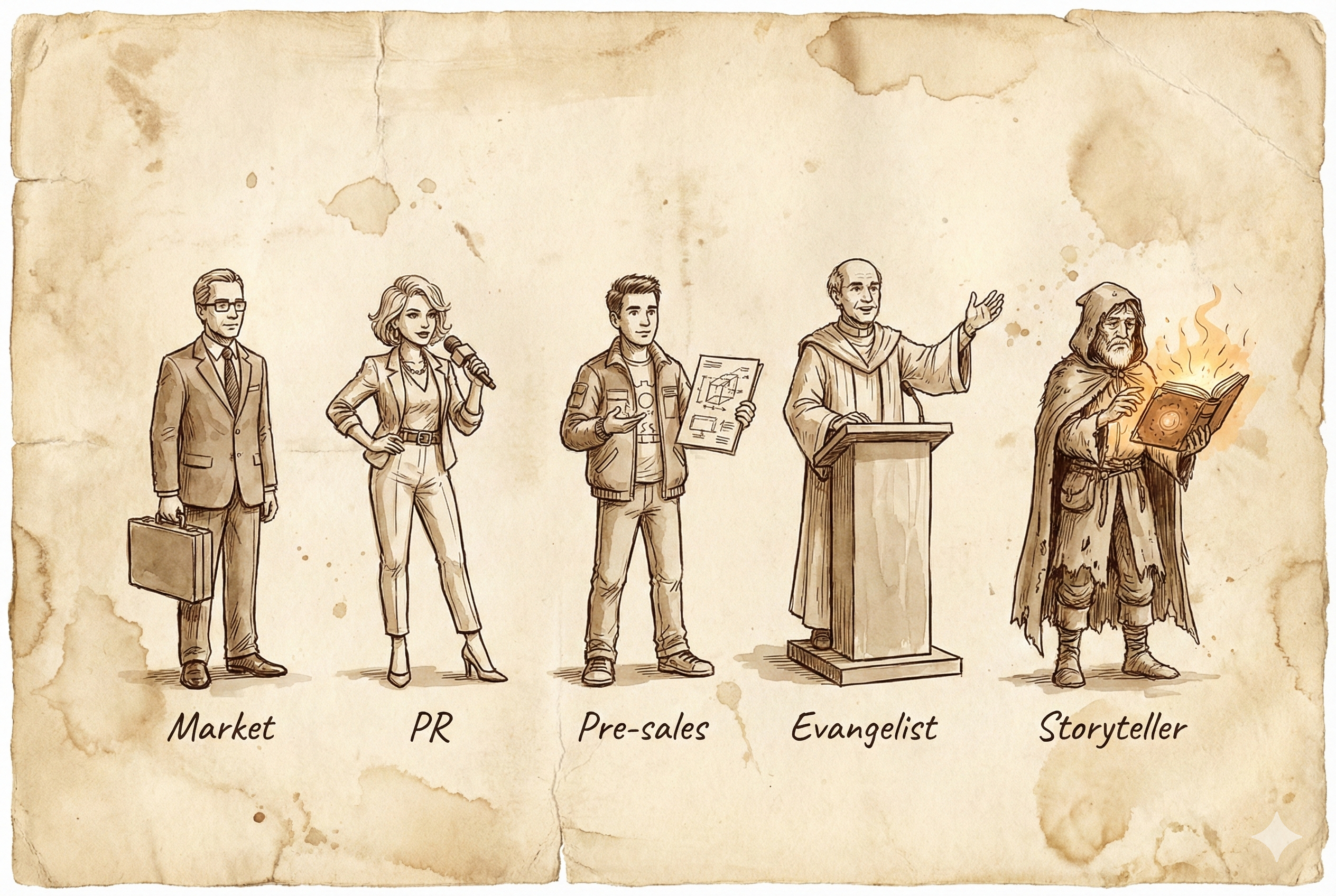 那我们就要思考一个问题了,都是对外进行内容输出的这样的一个职位,这次到底有什么不同呢?我们要知道Marketing(市场)、品牌、PR(公关),还有Sales Engineer(售前工程师),还有Evangelist(布道师),这个跟现在的Storyteller到底有什么不一样呢?咱们掰开了讲一下。