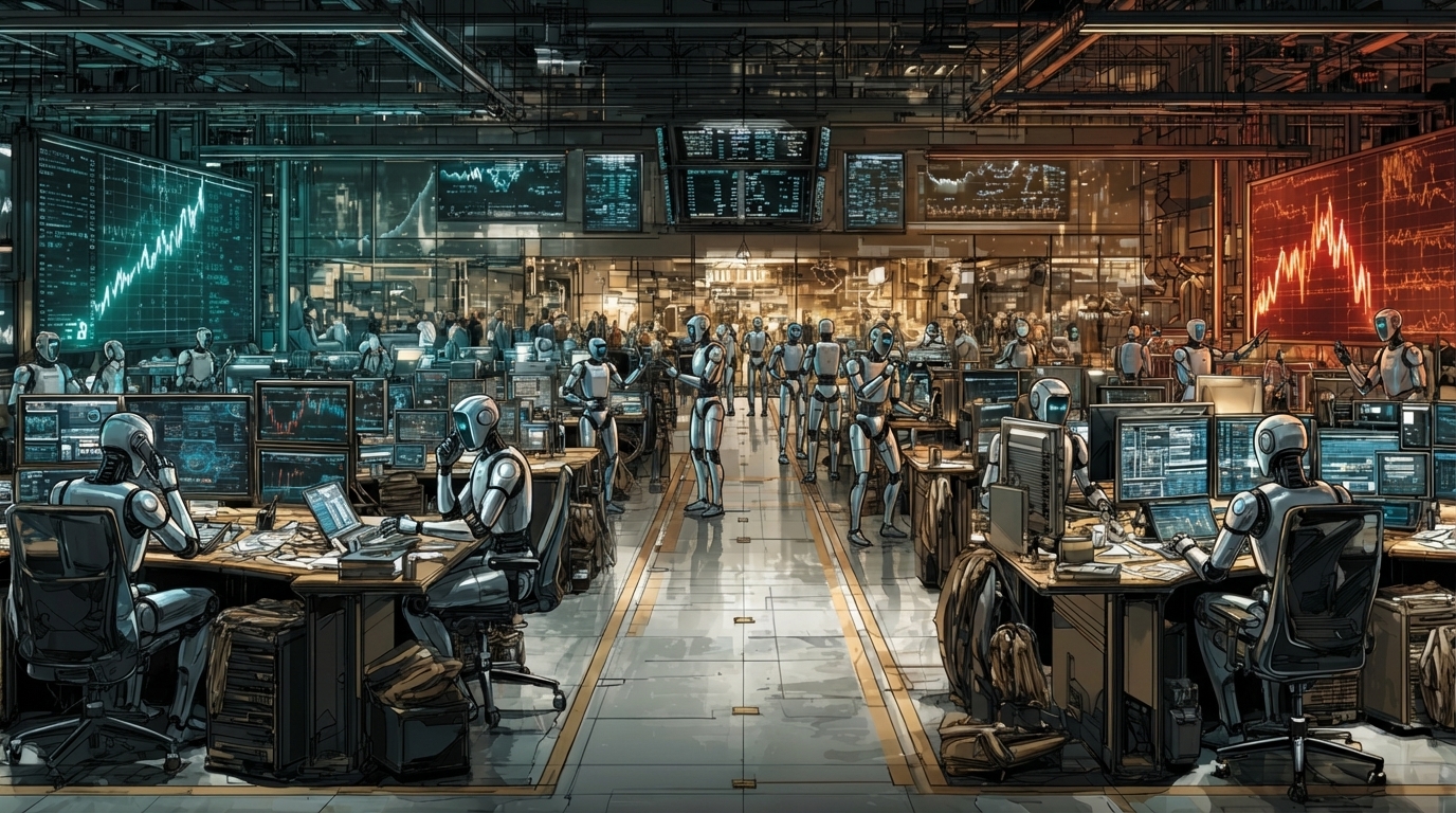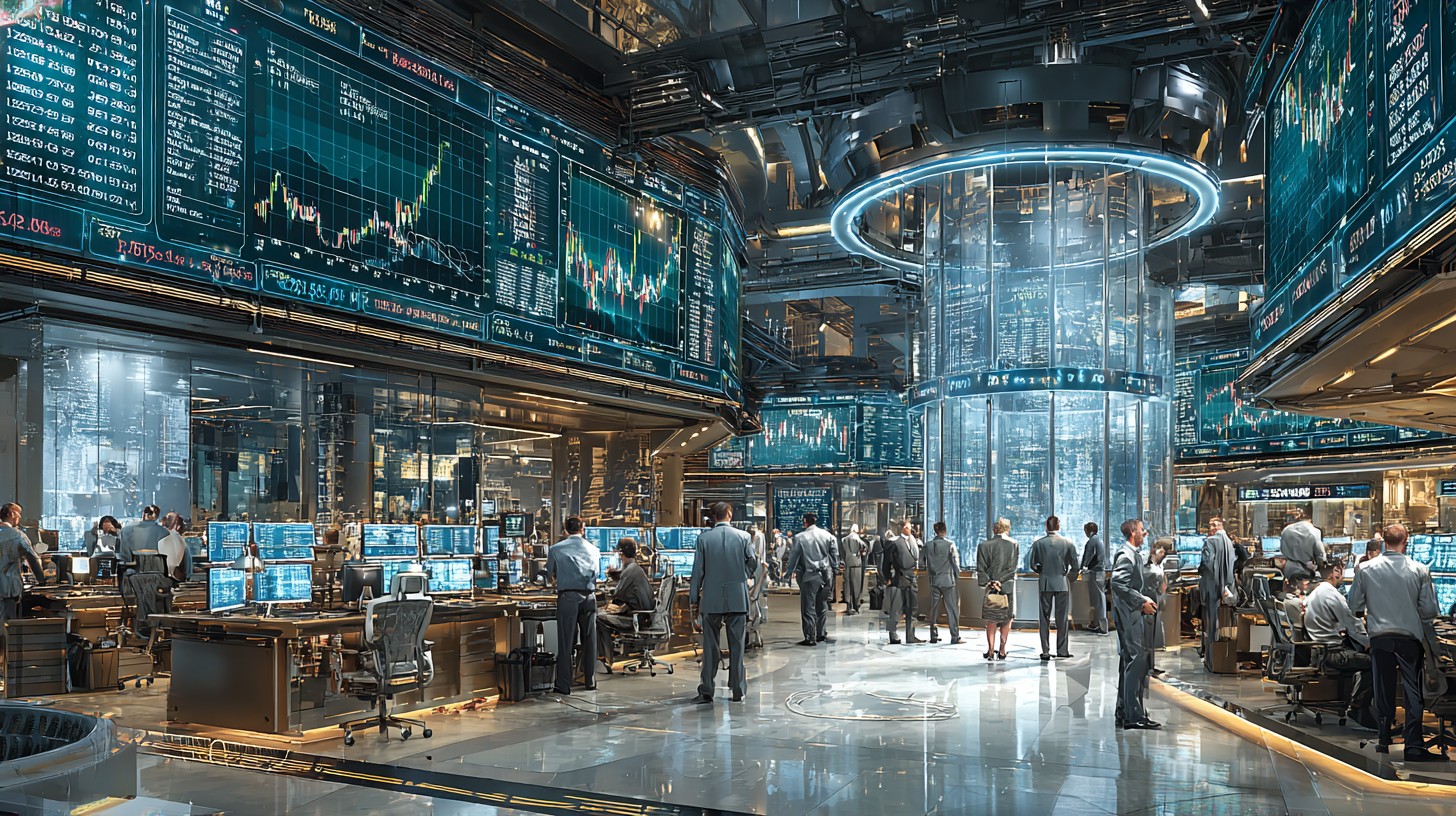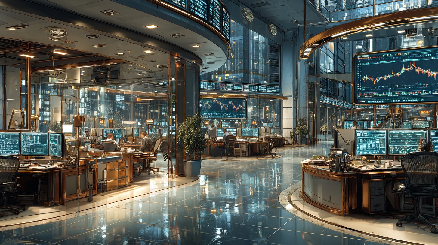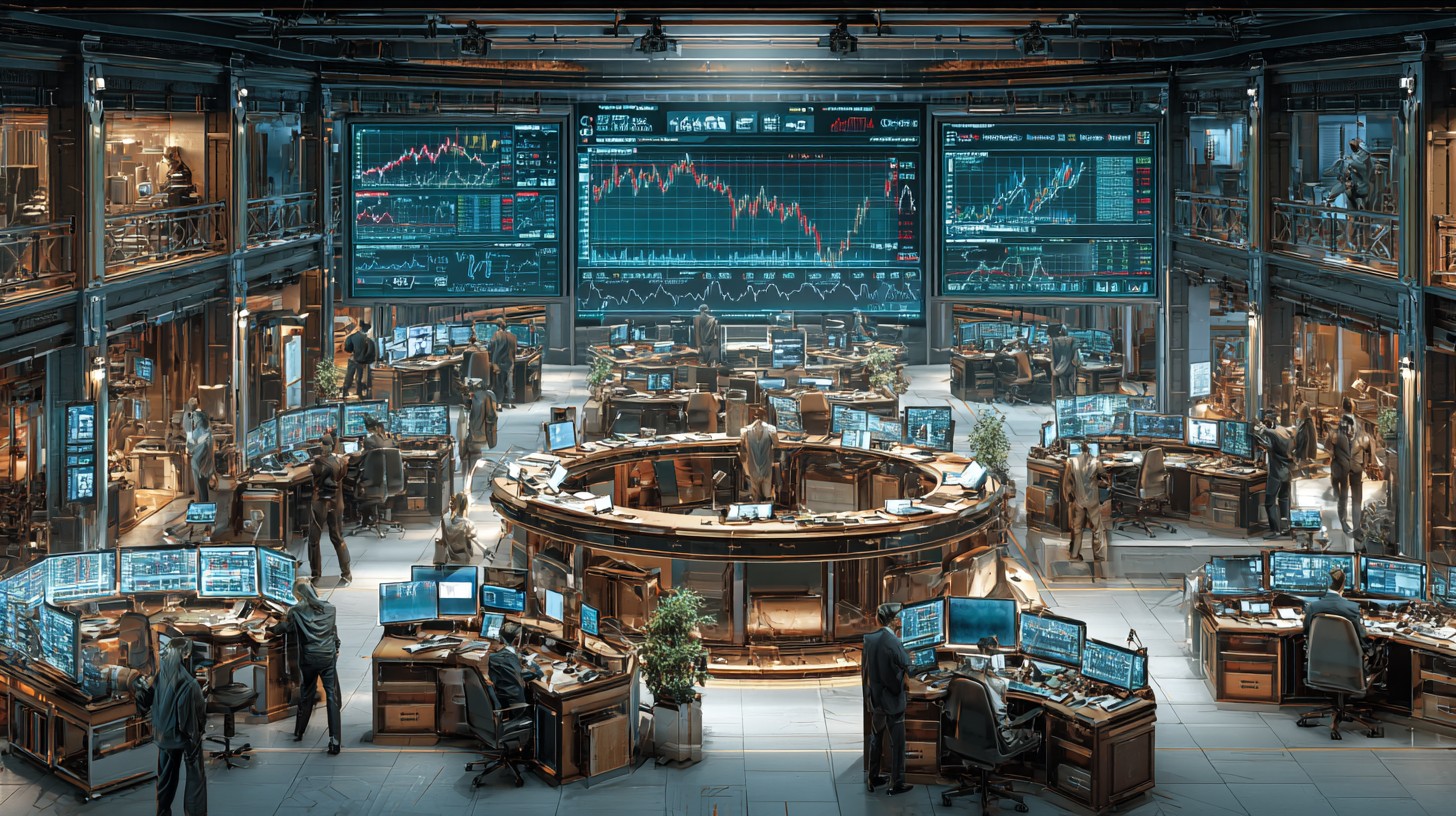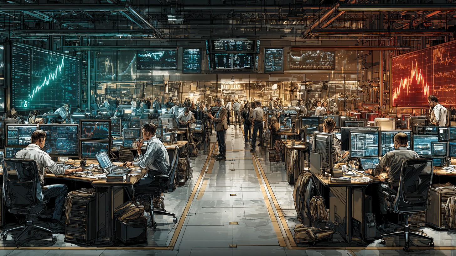 Prompt:high-contrast watercolor illustration, bustling stock exchange trading floor, one side featuring a vibrant green channel with glowing positive charts and upward arrows, the opposite side a vivid red channel with declining graphs and downward trends, traders and screens in sharp focus, glossy reflections on glass surfaces, dramatic neon cyan rimlight, deep navy background, cinematic composition with strong subject separation, minimal palette dominated by ink blue, neon cyan, and subtle gold accents, expansive legible negative space for overlay text, ultra-detailed, sharp edges –ar 16:9 –raw –s 250 –v 7.0 –p lh4so59