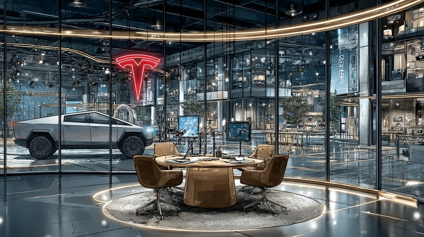 Prompt:high-contrast watercolor illustration, interior view from inside a minimalist podcast interview conference room in Tesla Texas Gigafactory, featuring a single round table with three chairs arranged around it, professional podcast setup including microphones on stands and camera equipment positioned for recording, through expansive floor-to-ceiling glass curtain walls revealing Cybertruck assembly line with angular stainless steel bodies advancing on conveyor systems in the vast factory floor beyond, neon cyan rim lighting, deep navy blue background, sharp subject separation, glossy reflections on glass walls round table surface and distant metallic Cybertruck surfaces, minimal palette dominated by ink blue neon cyan and subtle gold accents, cinematic composition, expansive legible negative space for text overlay, intricate ink washes, ultra detailed, sleek minimalist industrial sophistication –ar 16:9 –raw –s 250 –v 7.0 –p lh4so59