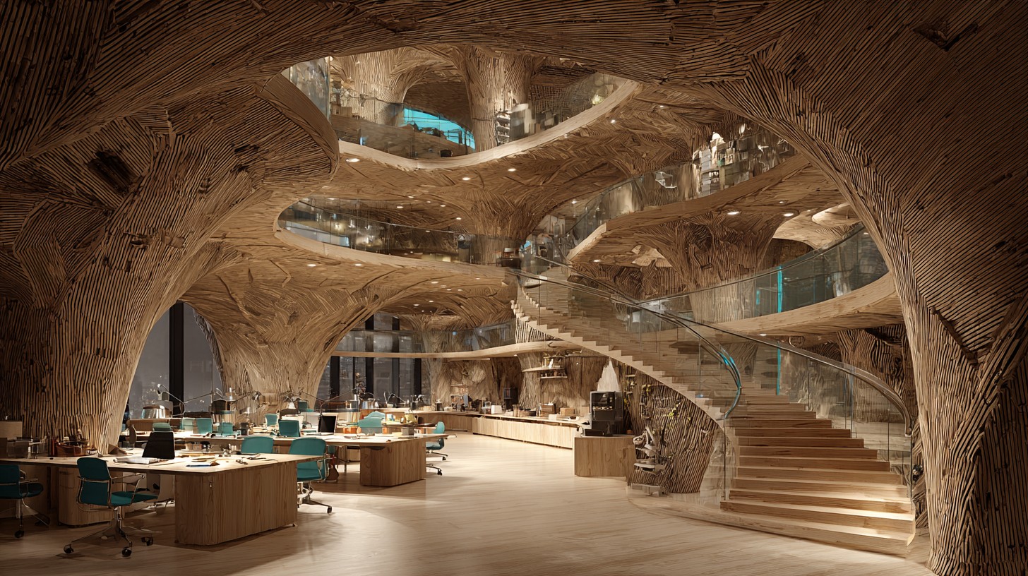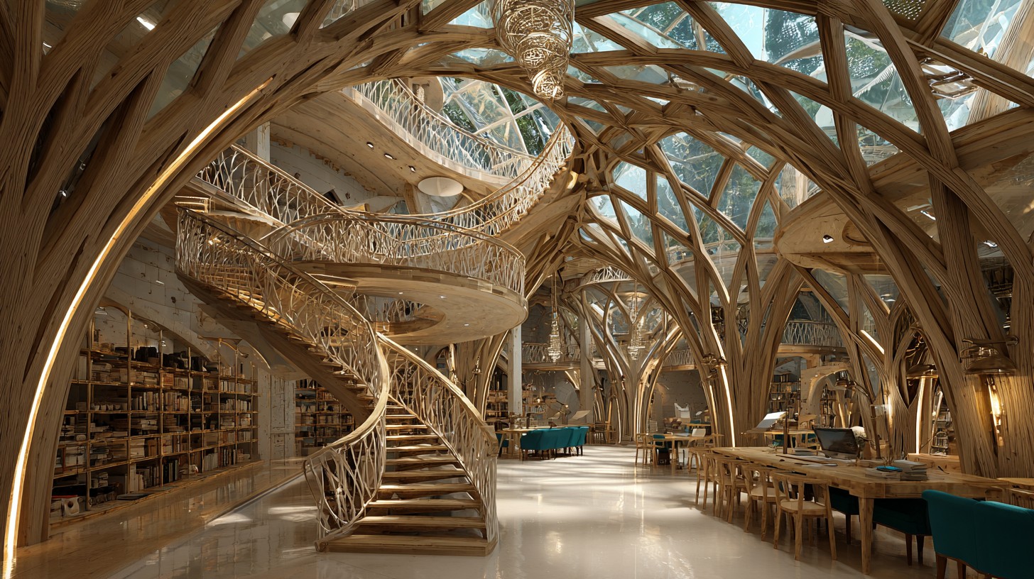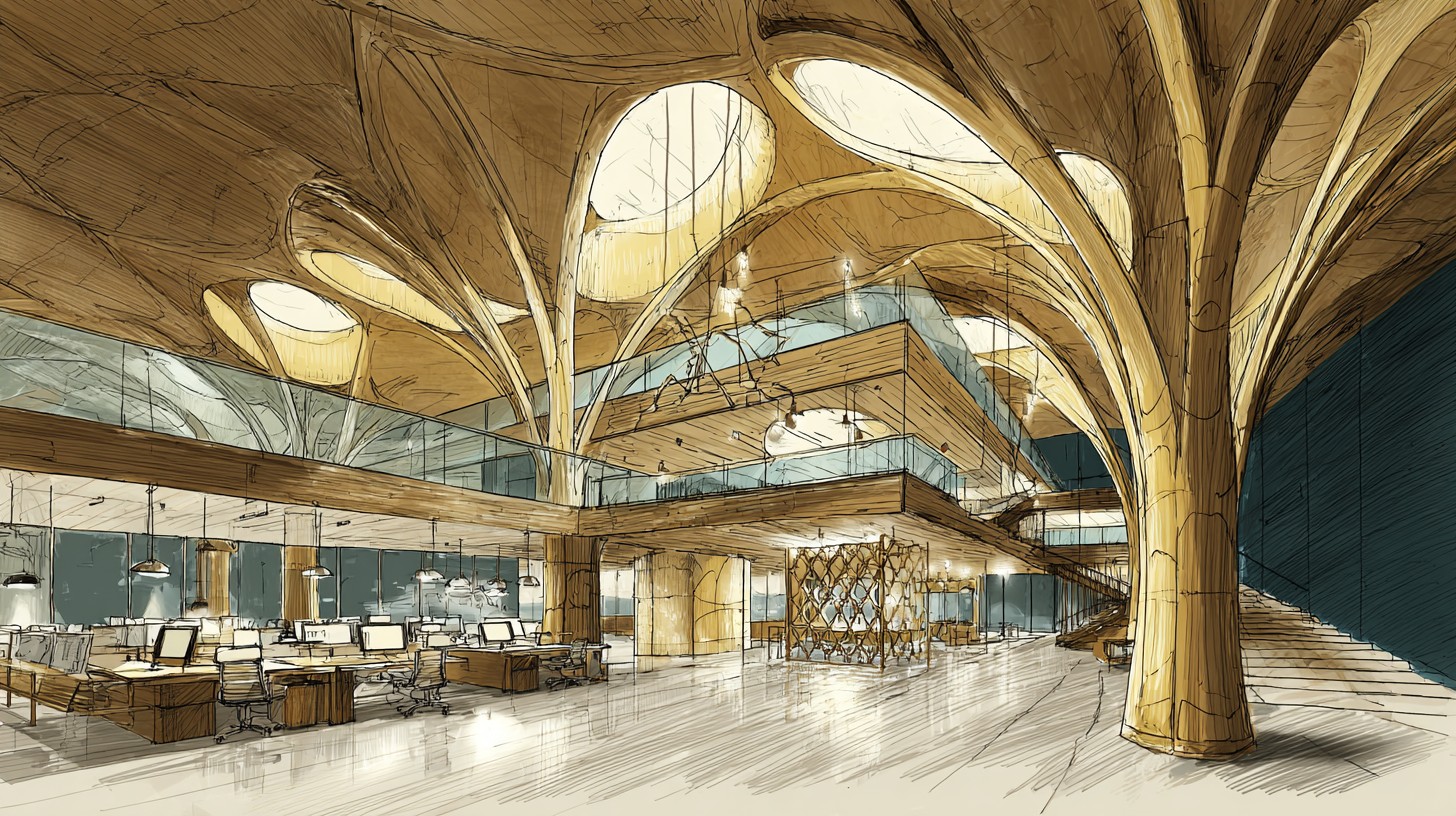 Prompt:Highly realistic-structure luminous watercolor + crisp ink line poster, interior studio perspective inside a giant tree hollow office, multi-level mezzanine floors with glass balustrades and brass brackets, ribbed timber vault ceiling, carved root columns, spiral ramp with mortise-and-tenon details, cable-suspended wooden bridge, open-plan creative studio zone with ergonomic desks, woven linen chairs, drafting station, blank pin-up wall and moodboards, small server nook behind a lattice screen, crystal prism pendants casting subtle caustic sparkles, polished lacquer wood floor with sharp glossy reflections, bright high-key lighting, neon cyan rimlight on edges, warm gold practicals + subtle coral specular hits, airy background with controlled deep navy gradients in recesses, crystal-clear atmospheric glow, cinematic interior composition, leading lines, strong separation, large clean negative space for text band across the top-right, medium-wide eye-level 35mm –no text, watermark, logo, clutter, extra limbs, lowres –ar 16:9 –stylize 120 –chaos 6 –v 7.0
