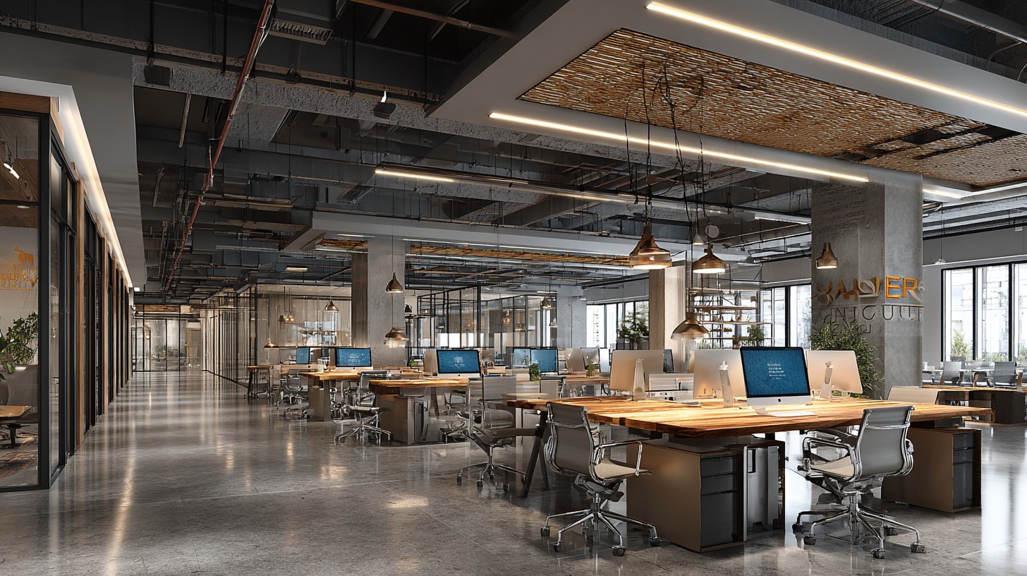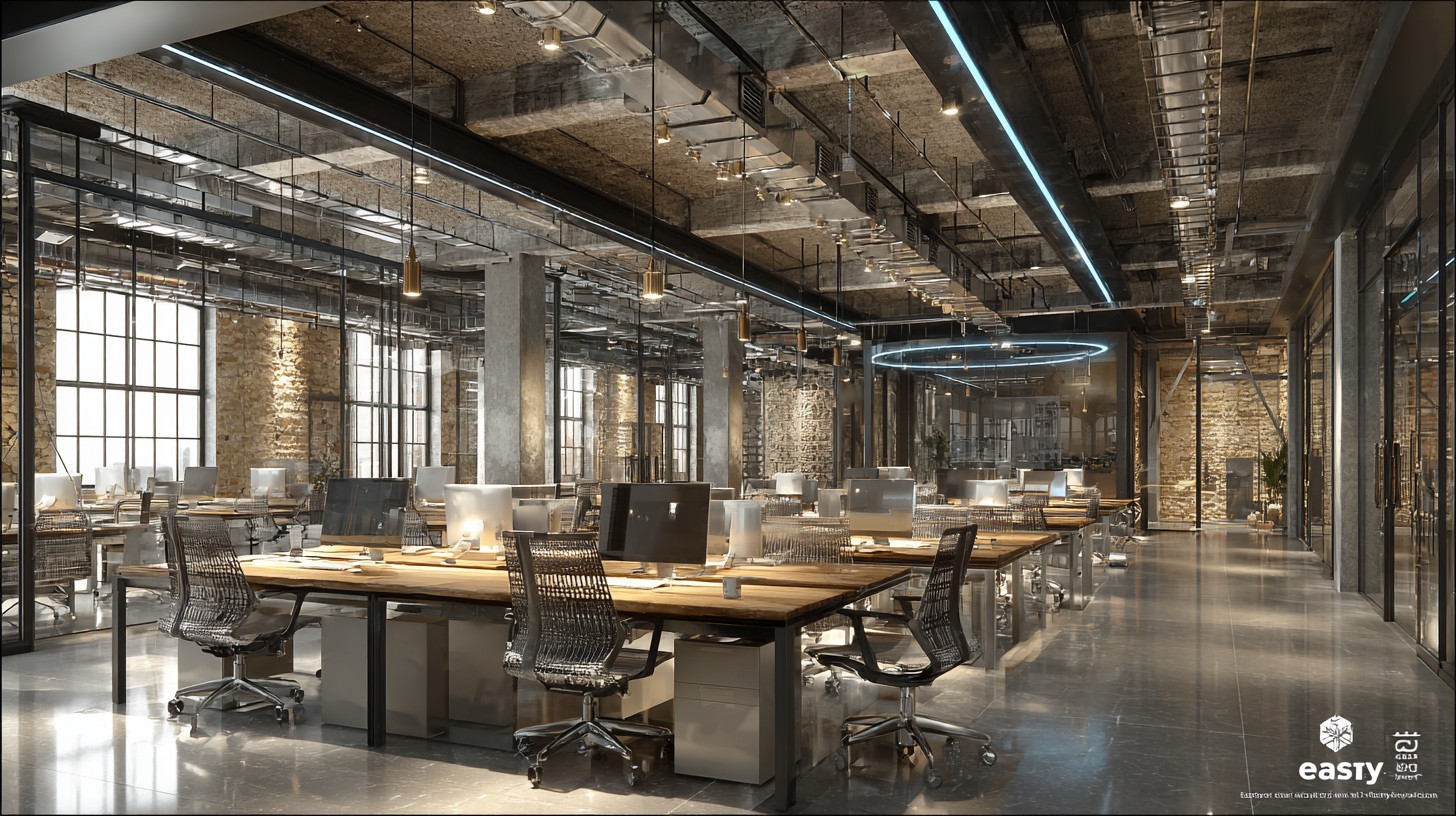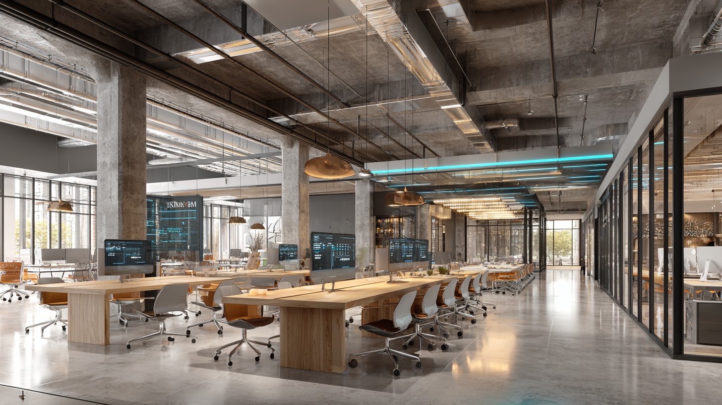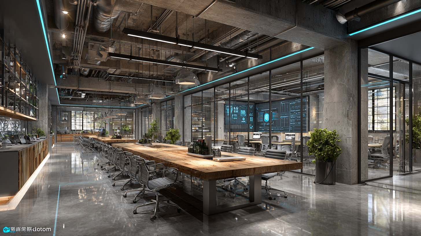 Prompt:Ultra-detailed luminous watercolor + crisp ink line architectural poster of a Beijing AI company loft open-plan office interior, realistic industrial materials: exposed fair-face concrete slab ceiling, blackened steel I-beams and columns, galvanized cable trays, linear HVAC ducts, large factory grid windows with sheer roller shades, glass partition meeting rooms with acoustic seals, polished concrete floor with sharp glossy reflections, long reclaimed-wood communal tables with aluminum legs, ergonomic task chairs, cable grommets and tidy power rails, minimal ceiling acoustic baffles, a clean LED strip “data ribbon” along a wall in neon cyan (abstract, no readable UI), bright high-key daylight + warm gold pendant practicals + subtle coral specular hits, deep navy gradient only in distant recesses, neon cyan rimlight on edges, crystal-clear atmospheric glow, cinematic wide interior composition, strong subject separation, huge clean negative space for headline banner, medium-wide eye-level 35mm, rule of thirds –no text, watermark, logo, clutter, extra limbs, lowres –ar 16:9 –stylize 120 –chaos 6 –v 7.0 –p lh4so59