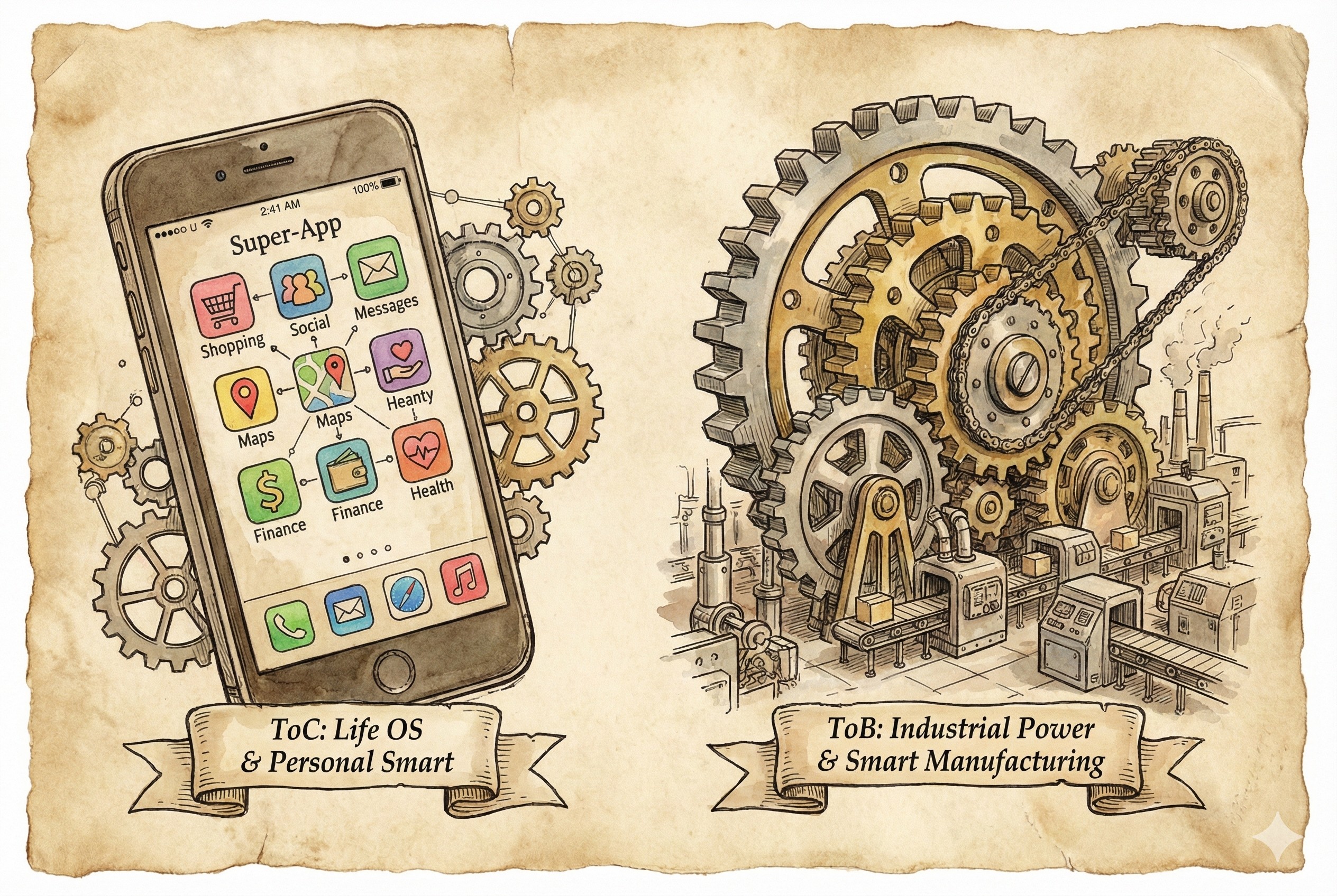 为什么?智谱的老大上来讲说这个ToC很有机会,我们很看好ToC,但其实智谱自己是做ToB的。姚顺雨所在的腾讯明明是一个C端大厂,因为他做微信、做QQ、做游戏嘛,但是他也在努力的说我们要去做ToB的东西,要去做AI智能。这到底是为什么?因为你ToC的话就要去跟豆包去竞争去,大家又打不过他。