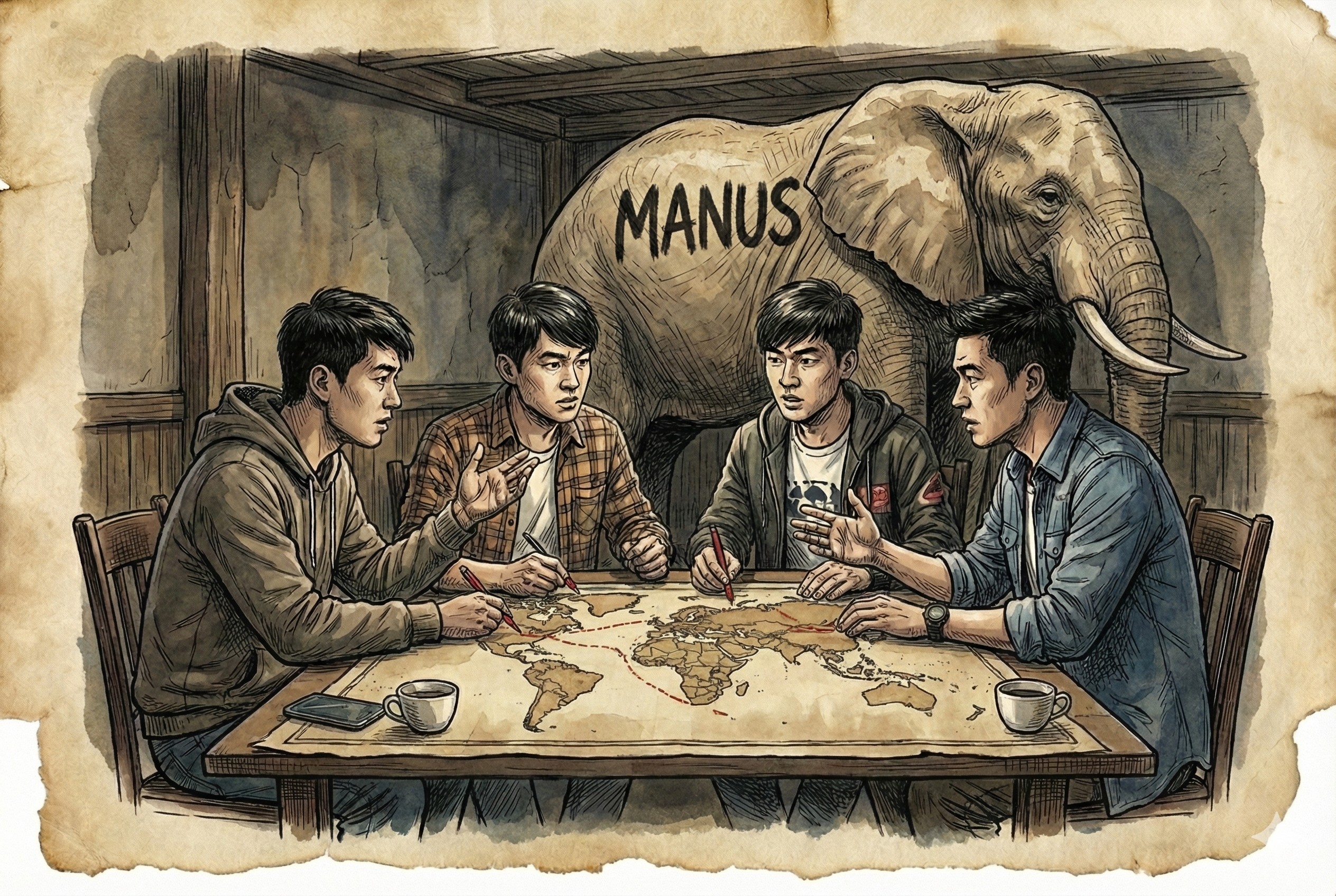 大家也就讲到这儿就完事了。为什么这话题就停在这儿了?房间里的大象,有人零星提起,但是都不敢深入。这房间里大象是谁?你想出海还做通用agent的,不就是manus吗?没法说呀。你把它提出来,那后边怎么弄?你说到底是审查通过、审查不通过,还是一个什么情况?人家拎桶跑路了,跑新加坡去了,上那边洗白去了,最后还没洗白。这玩意你没法讲。