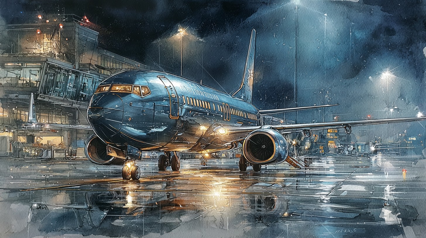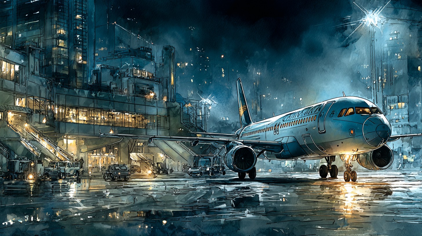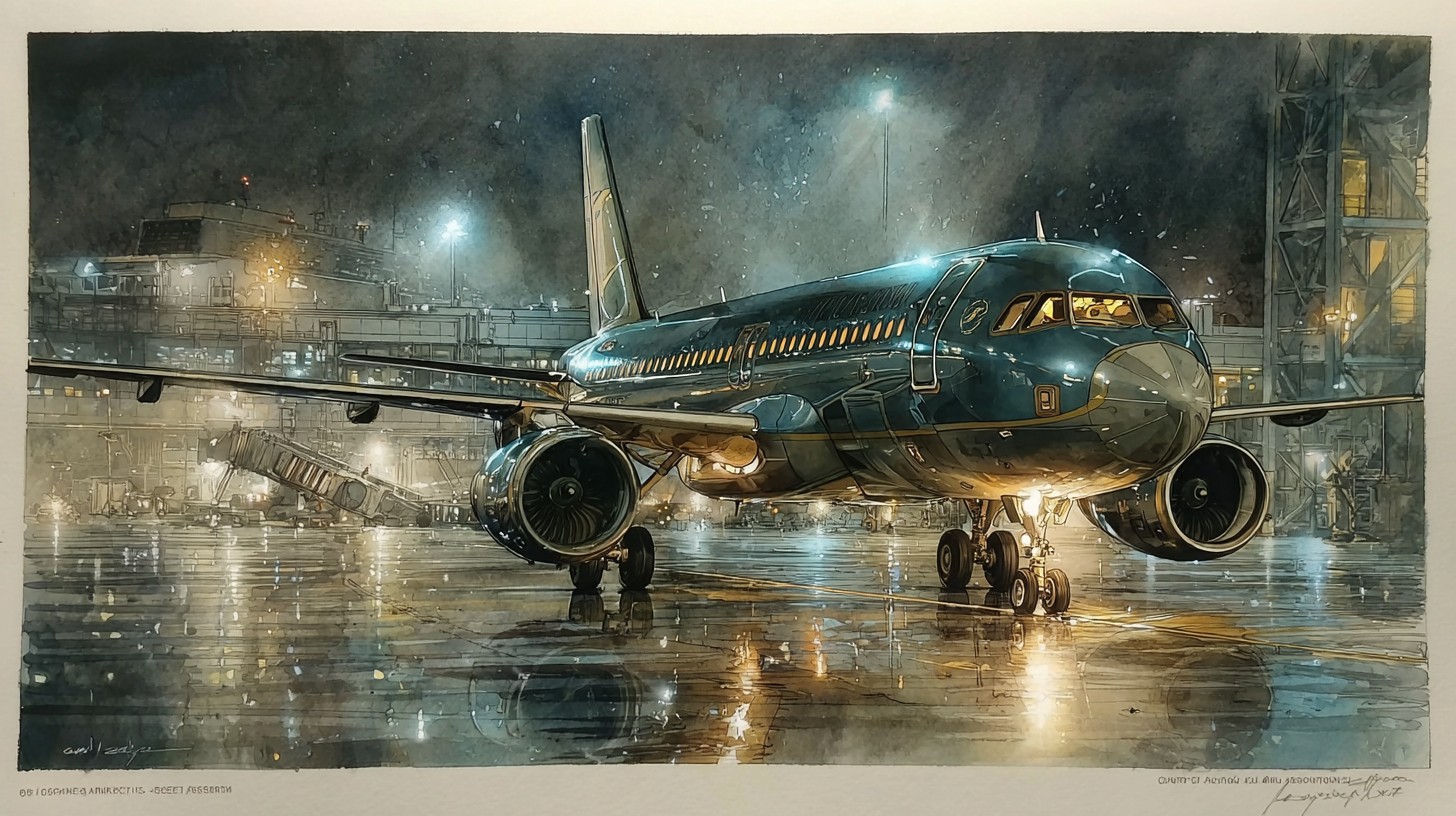 Prompt:Hyper-detailed watercolor realism, high-contrast night airport scene: a single commercial airplane isolated on a wet apron, ominous eerie mood, distant terminal building with sparse lights, deep navy sky, neon cyan rim light and edge glow on fuselage and wings, sharp foreground/background separation, glossy puddle reflections on tarmac, minimal palette (ink blue, neon cyan, restrained gold accents), fine paper texture, accurate aircraft proportions, rivets and panel lines subtly suggested through ink detailing, cinematic framing, 50mm look, medium-wide shot, eye-level, ultra clean negative space for headline text –ar 16:9 –v 7.0 –stylize 120 –chaos 4 –no people, vehicles, baggage carts, text, watermark, logo, grainy noise, blurry, double exposure, extra wings, extra engines, deformed plane, oversaturated neon, cartoon, anime –p lh4so59