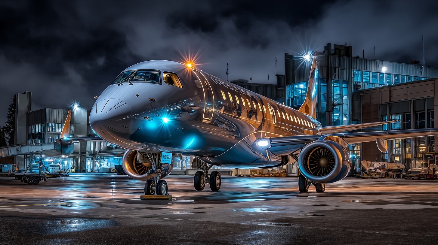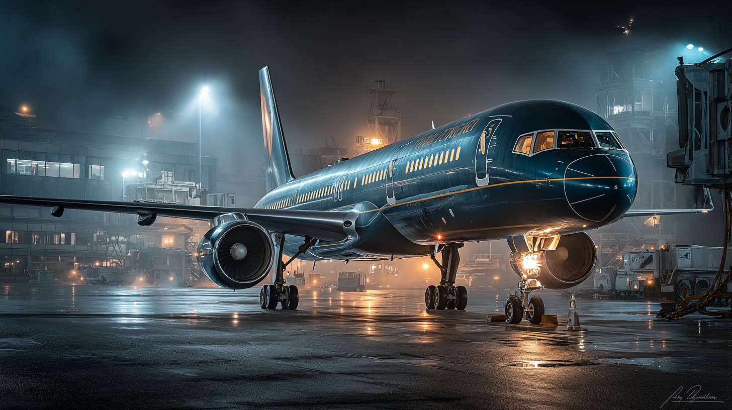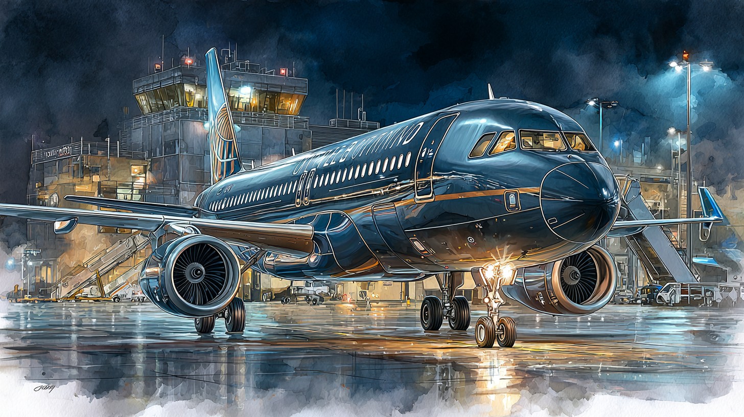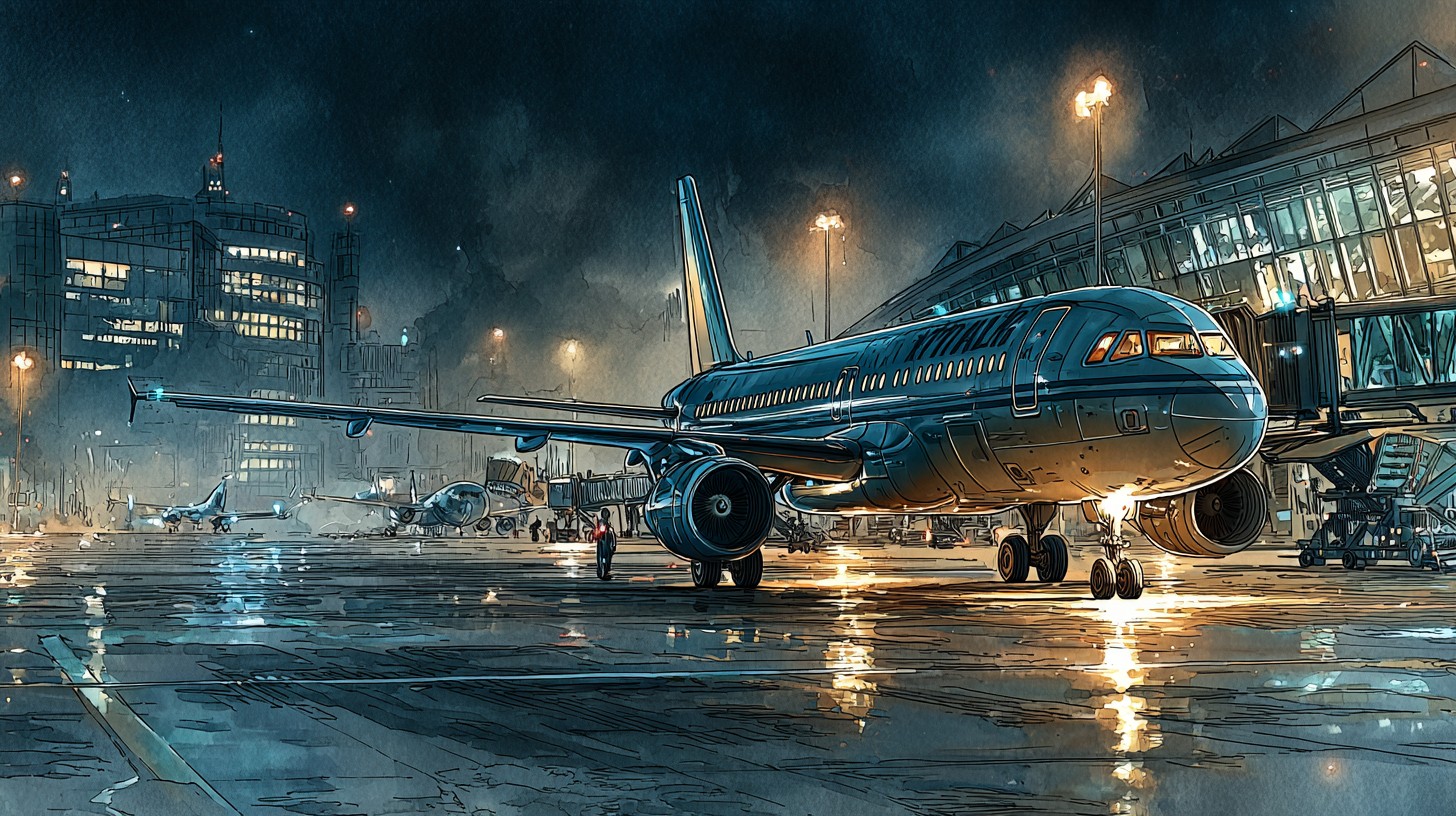 Prompt:Hyper-detailed watercolor realism, high-contrast night airport scene: a single commercial airplane isolated on a wet apron, ominous eerie mood, distant terminal building with sparse lights, deep navy sky, neon cyan rim light and edge glow on fuselage and wings, sharp foreground/background separation, glossy puddle reflections on tarmac, minimal palette (ink blue, neon cyan, restrained gold accents), fine paper texture, accurate aircraft proportions, rivets and panel lines subtly suggested through ink detailing, cinematic framing, 50mm look, medium-wide shot, eye-level, ultra clean negative space for headline text –ar 16:9 –v 7.0 –stylize 120 –chaos 4 –no people, vehicles, baggage carts, text, watermark, logo, grainy noise, blurry, double exposure, extra wings, extra engines, deformed plane, oversaturated neon, cartoon, anime –p lh4so59
