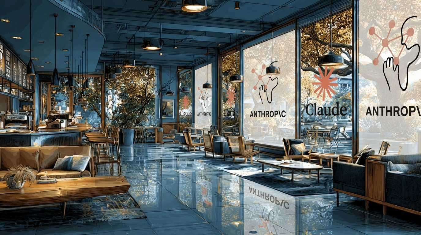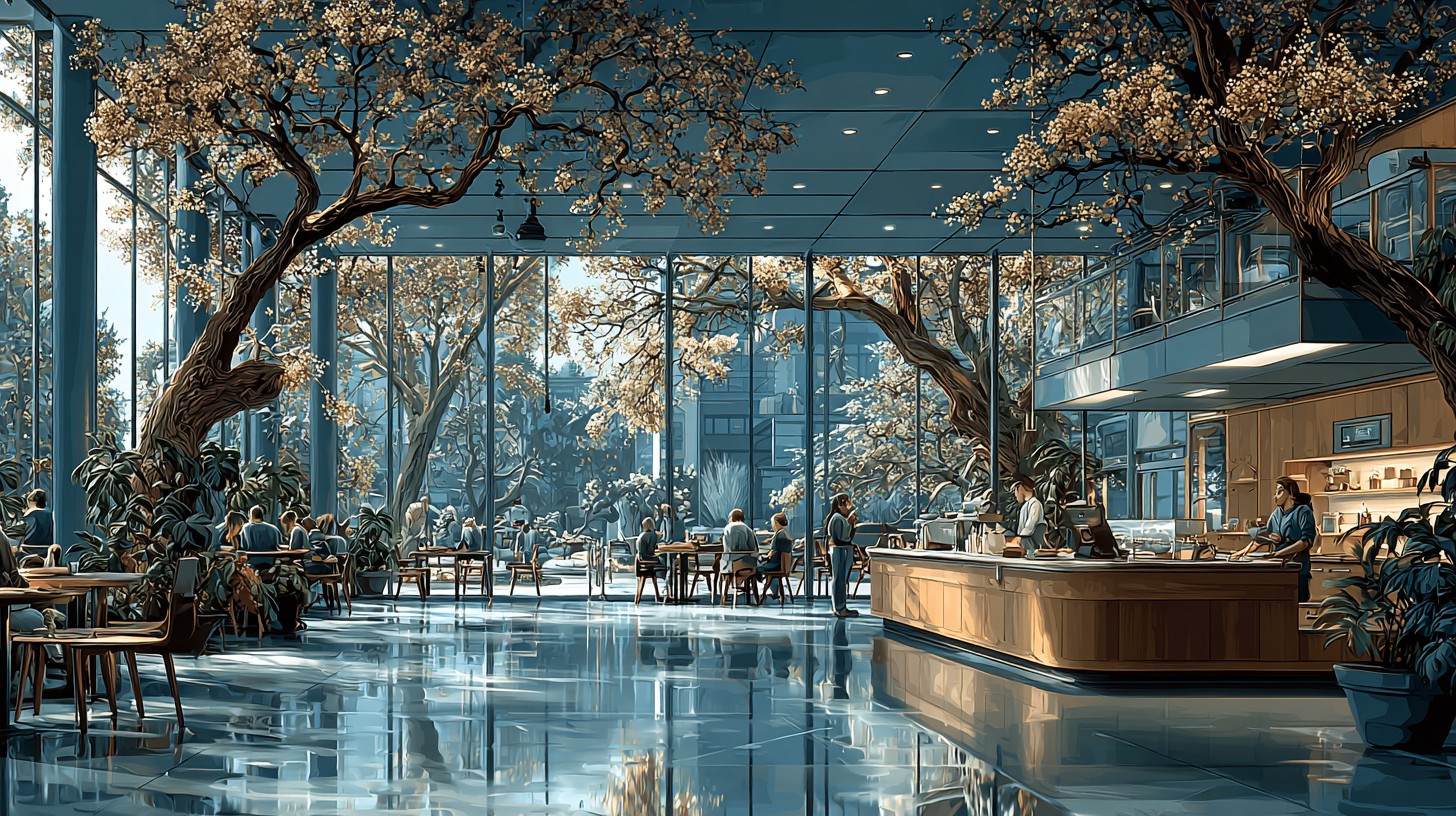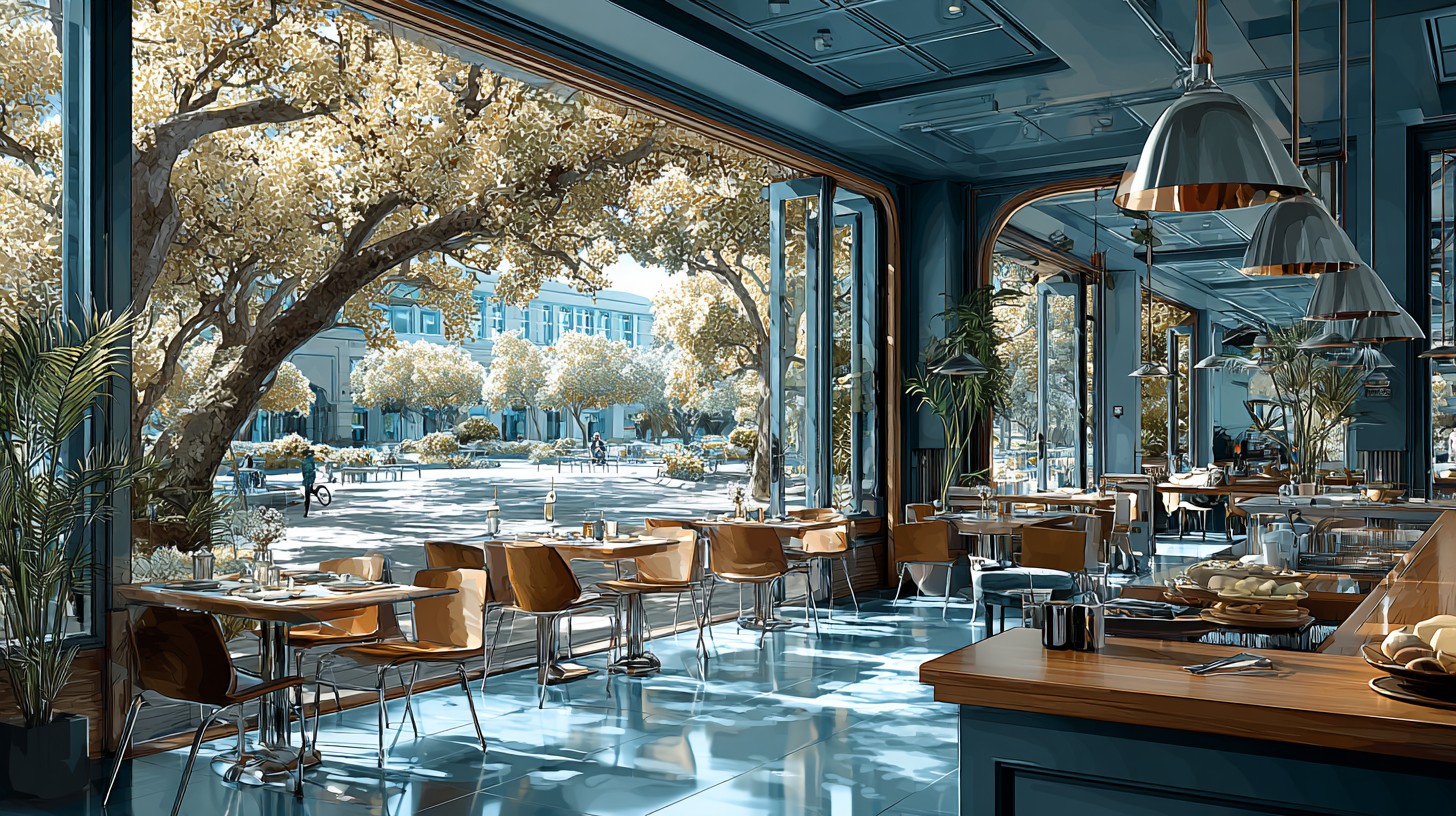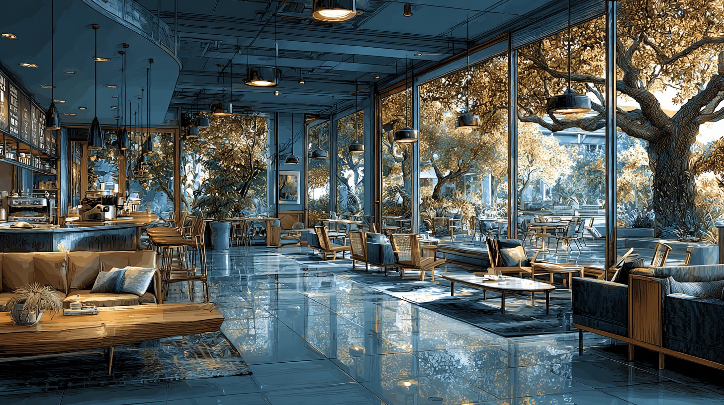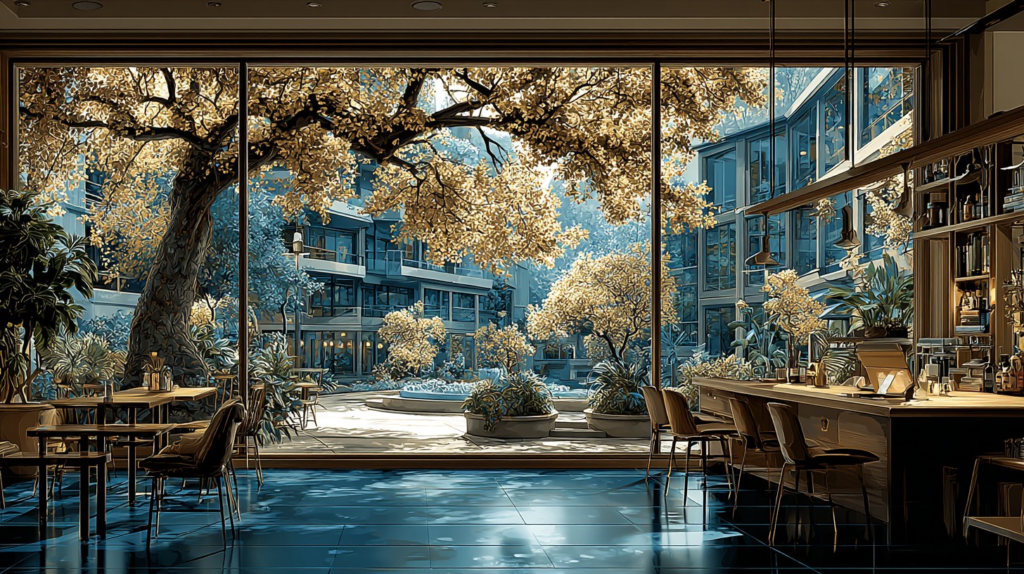 Prompt:Interior of a Bay Area cafe looking out to a Silicon Valley tech campus in spring, blooming trees as gold accents, a high-contrast watercolor scene, neon cyan rimlight, deep navy background, cinematic composition, sharp subject separation, minimal palette (ink blue, neon cyan, gold accents), glossy reflections, large empty negative space in foreground for character overlay, high resolution –ar 16:9 –stylize 300 –v 7.0 –p lh4so59