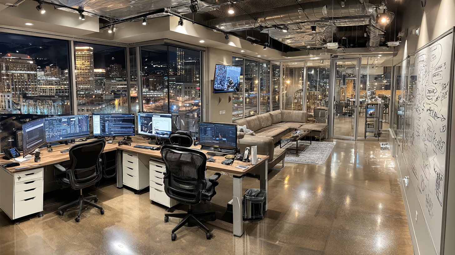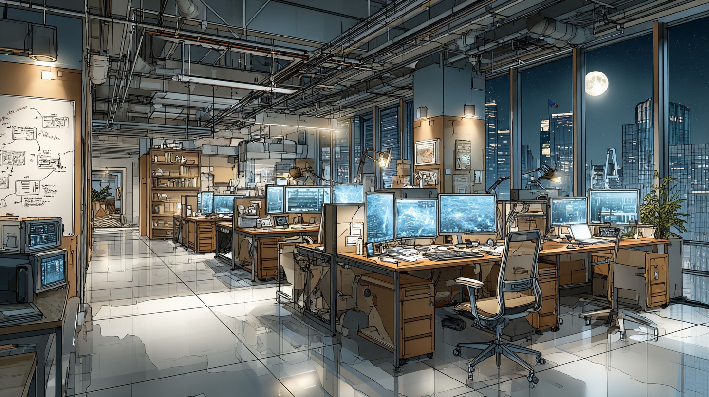 Prompt:Deserted xAI office in Silicon Valley after hours, no people, open-plan workspace converted into a quiet coding studio vibe, empty ergonomic chairs, dual-monitor desks in sleep mode, legal-style meeting lounge elements repurposed as developer corners, whiteboards with abstract diagrams (no readable text), server rack glow, cables neatly managed, floor-to-ceiling glass wall showing a modern city skyline under a bright full moon, moonlight and neon reflections on polished floor, cinematic hand-painted watercolor animation look, ink-and-pencil linework, visible paper grain, high contrast, high saturation, medium-wide eye-level shot, rule of thirds, clear subject-background separation –v 7.0 –ar 16:9 –stylize 180 –chaos 5 –no people, person, humans, faces, silhouettes, crowd, readable text, gibberish text blocks, watermark, logo, signature, photorealism, 3d render, blurry, lowres –p lh4so59