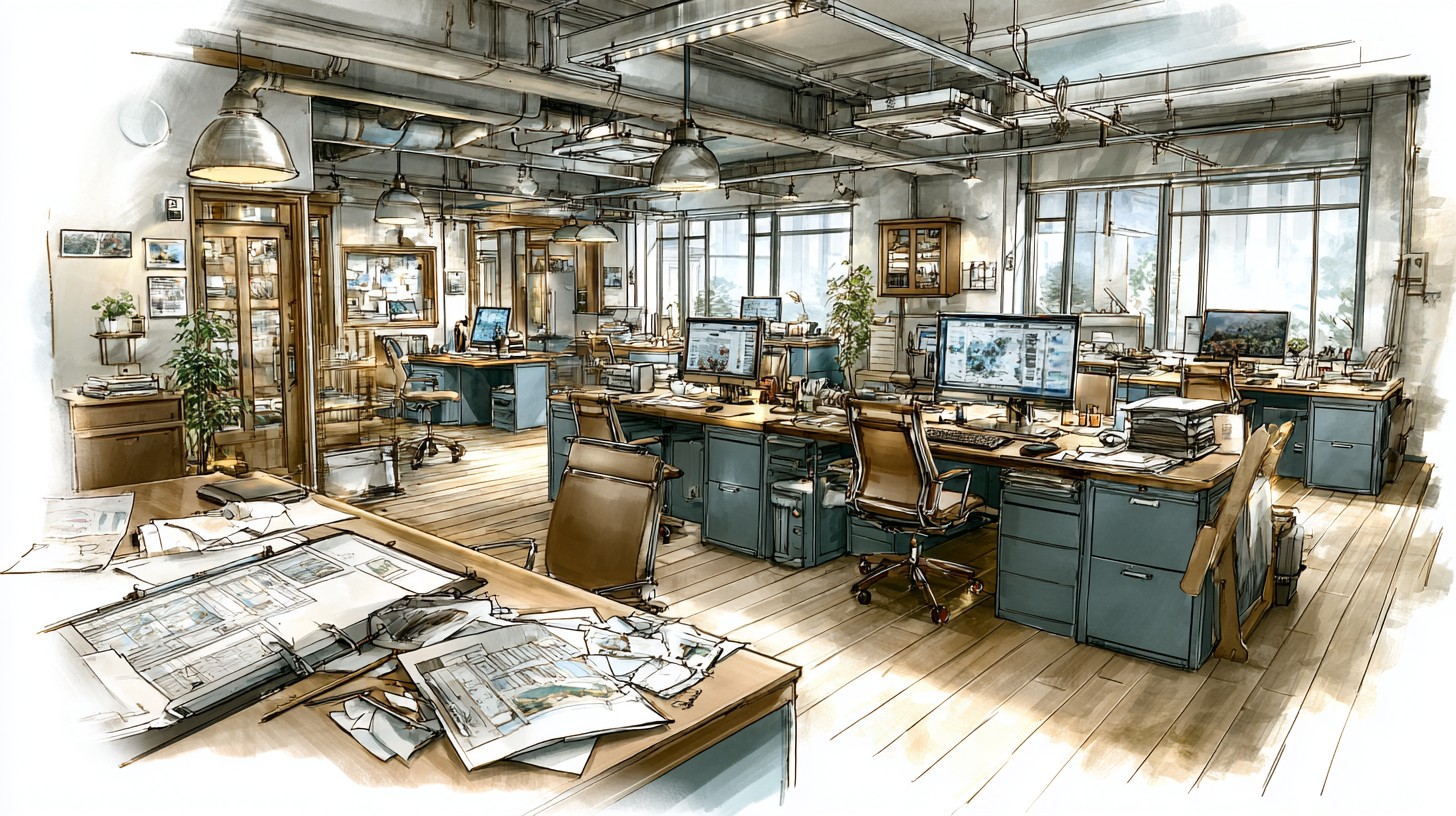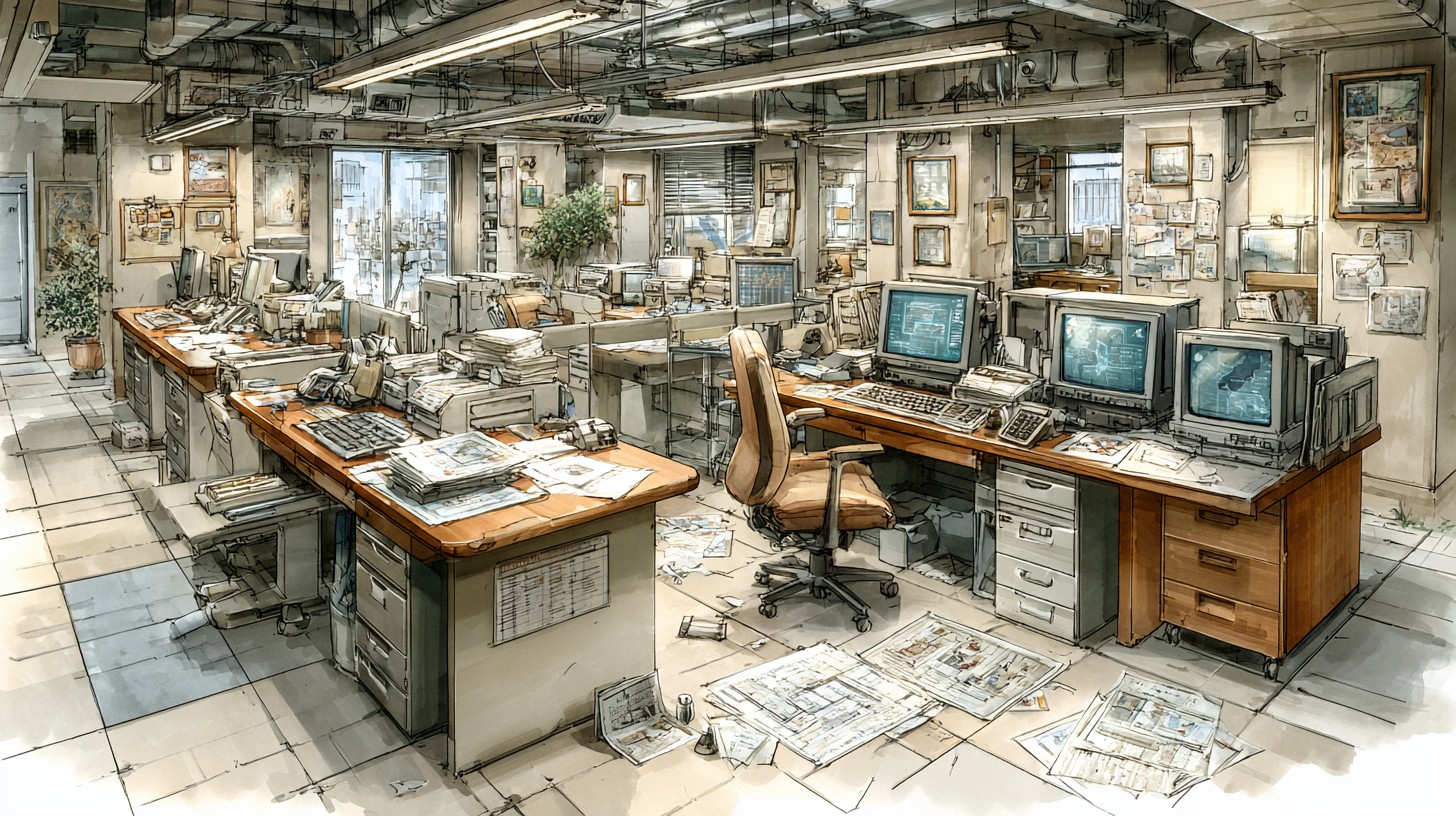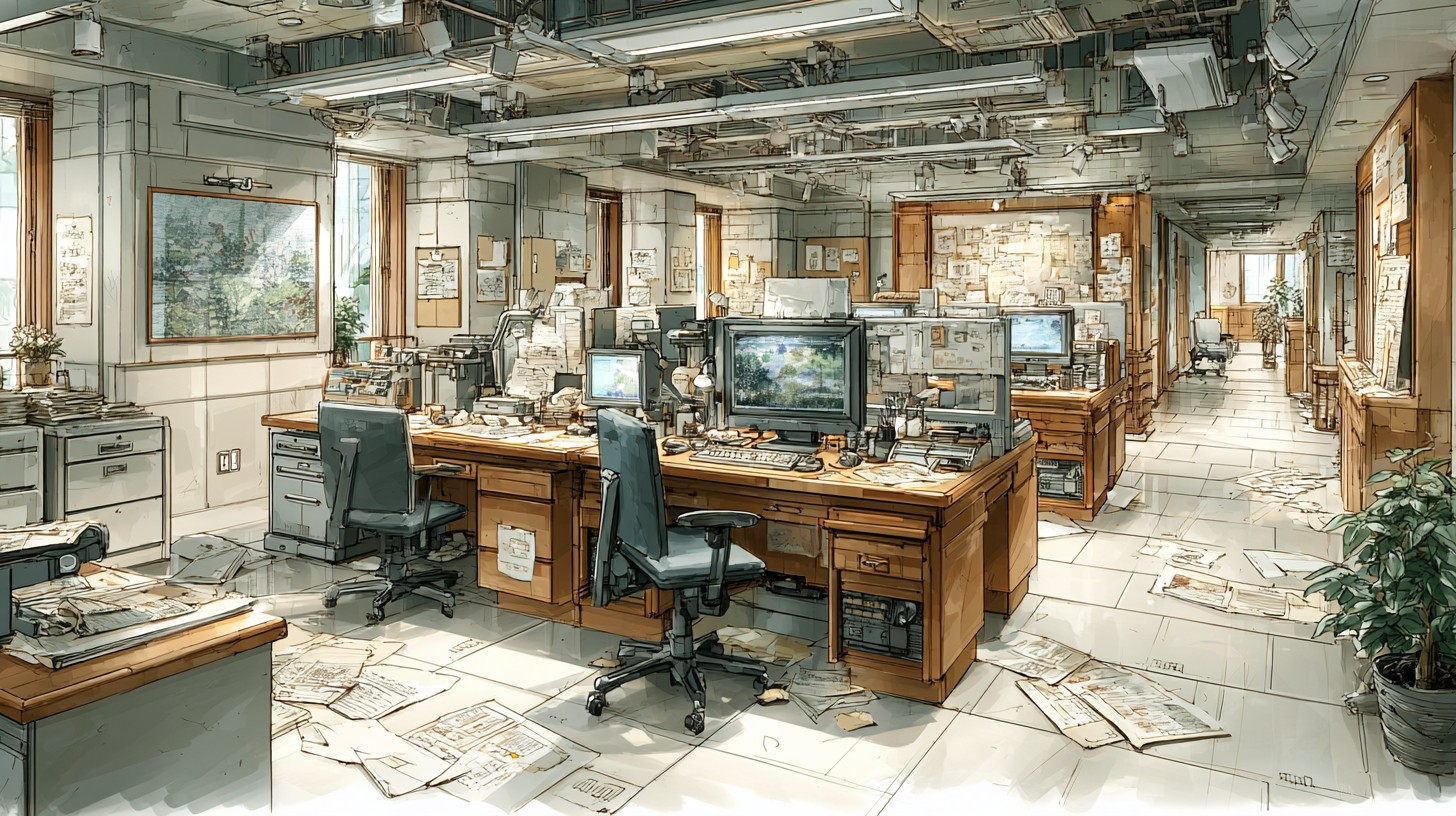 Prompt:in the style of Hayao Miyazaki, Studio Ghibli, hand-drawn manga storyboard aesthetic, watercolor gouache textures, delicate ink linework, Silicon Valley xAI open-plan AI company office floor, half of the workstations abandoned with empty chairs and dark monitors, crumpled papers and discarded printouts scattered across desks and floor, quiet post-boom atmosphere, 24mm wide establishing shot, eye-level, environmental framing, center negative space reserved for presenter, no dominant hero subject, balanced depth layers, spacious composition, soft directional window light, subtle rim light, muted teal and warm beige with dusty gray accents, rich environmental storytelling details, –no central hero character, spotless office, crowded foreground people, logo-heavy branding, watermark, text overlay –ar 16:9 –stylize 220 –chaos 10 –v 7.0 –p lh4so59