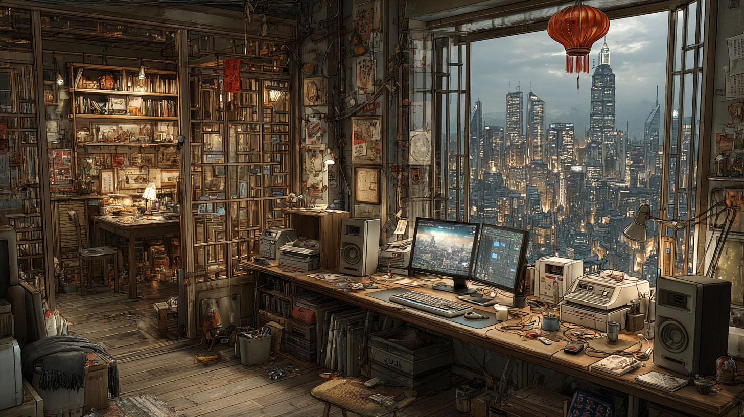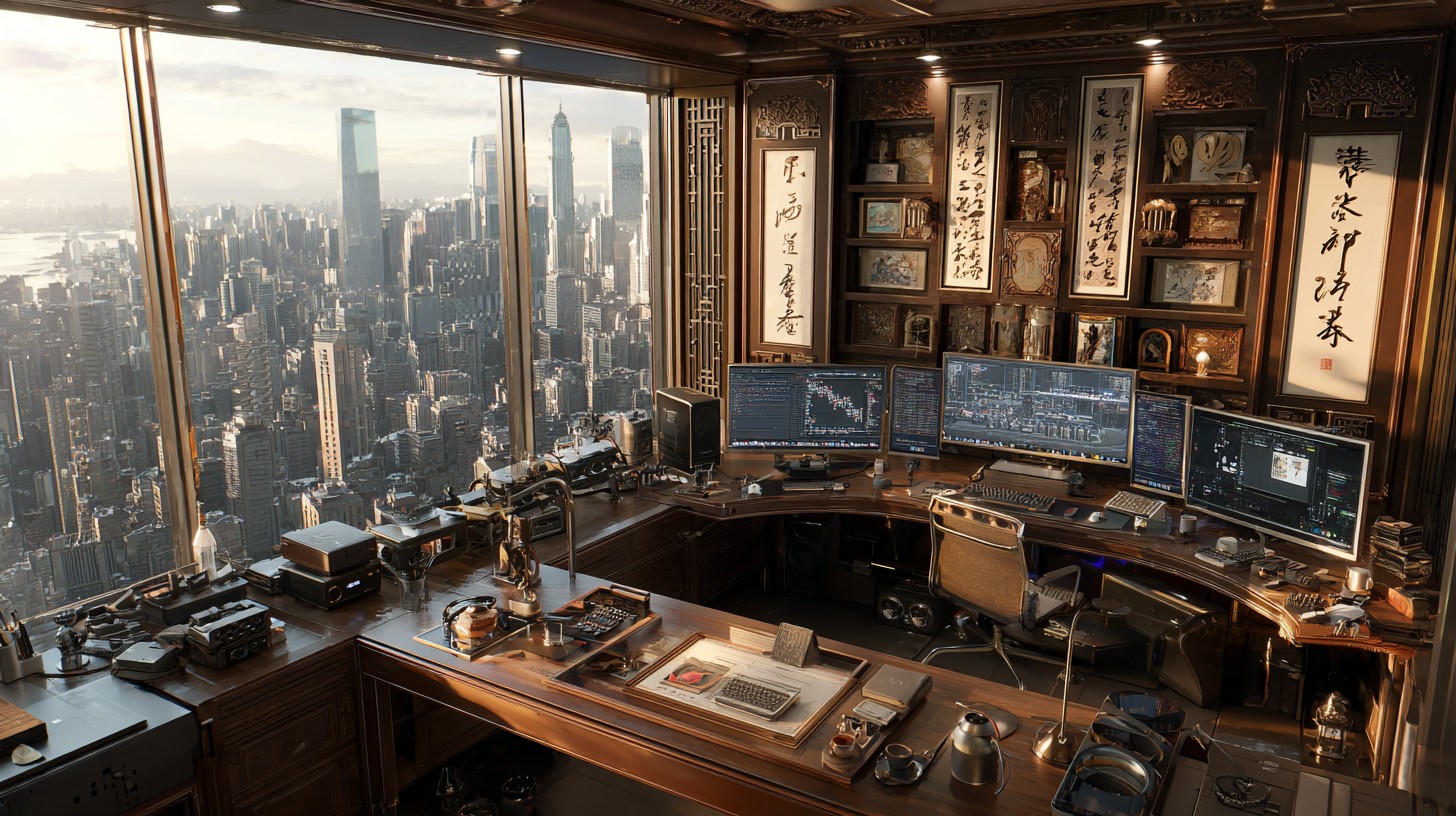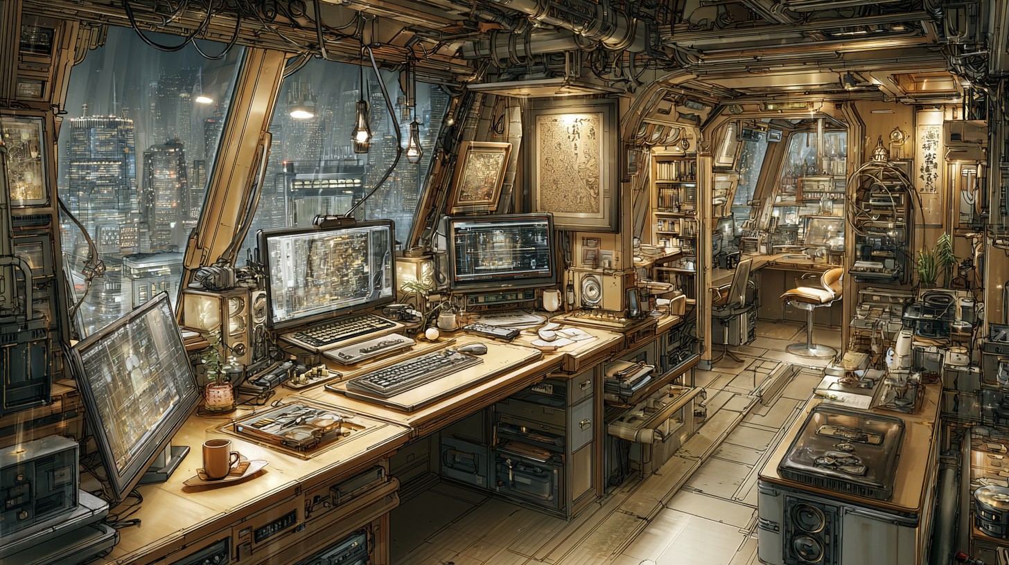 Prompt:in the style of Moebius (Jean Giraud), detailed ligne claire realism, precise ink contours and watercolor rendering, maximalist modern-Chinese high-rise computer studio in Beijing, every corner filled with refined details: carved wood partitions, brushed metal fixtures, porcelain pieces, calligraphy frames, custom PC tower, multi-display workstation, gaming console, controller rack, DAC, amplifier, stereo speakers, desk microphones, mechanical keyboard, mouse, handheld consoles, storage drawers, foreground desk with tea cup snack tray and notes, no occupants visible, eye-level 28mm interior shot with deep perspective to skyline window, warm golden practical lights with subtle neon reflections, intricate micro-detail and cozy-tech domestic mood –no people, person, human figure, face, body, text, watermark, logo, empty cold ambience, plastic CGI texture –ar 16:9 –stylize 130 –chaos 6 –v 7.0 –p lh4so59