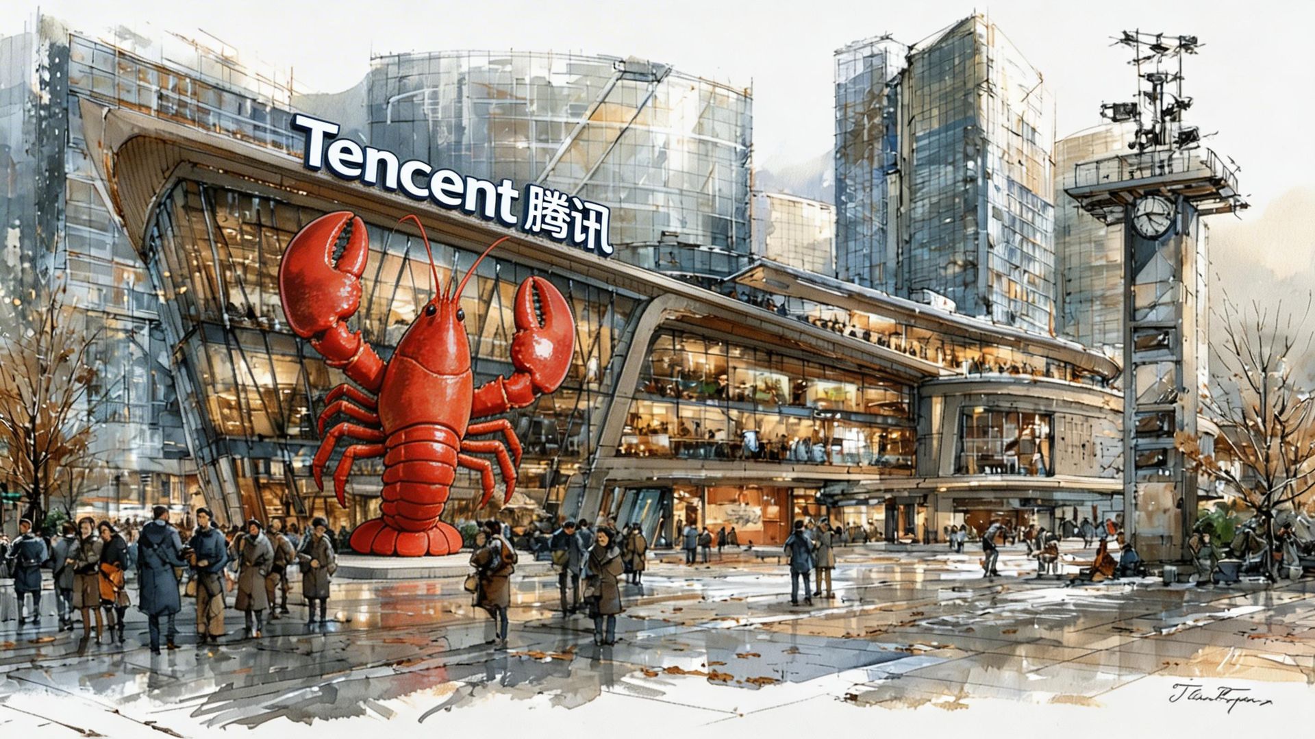深圳腾讯大厦楼下广场人头攒动,工程师在临时服务台前为排队市民安装“龙虾”,有人举着手机扫码,桌上摆着写有 OpenClaw 的牌子,春日城市广场的热闹场景,羊皮纸,钢笔彩色手绘的统一风格。