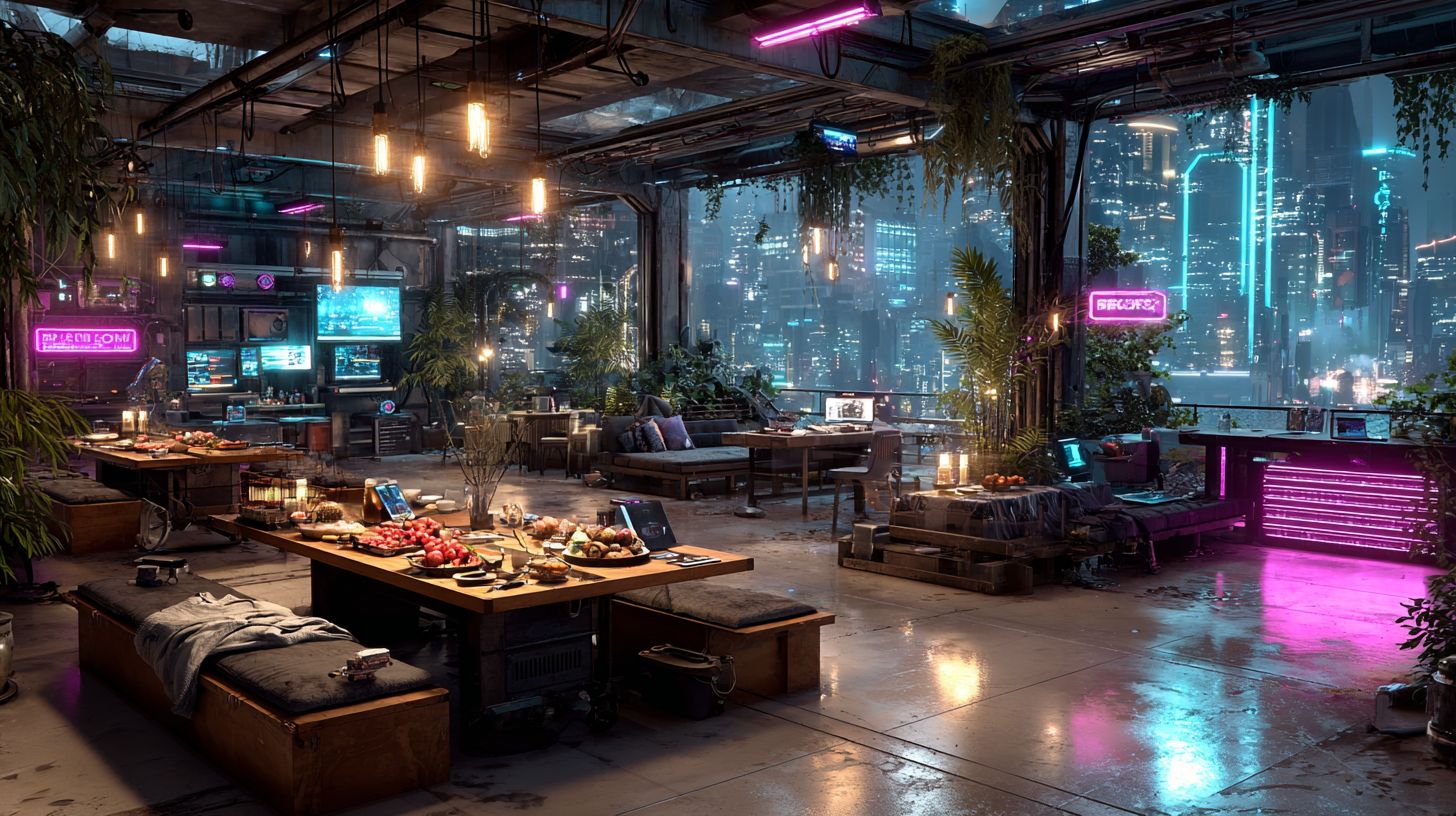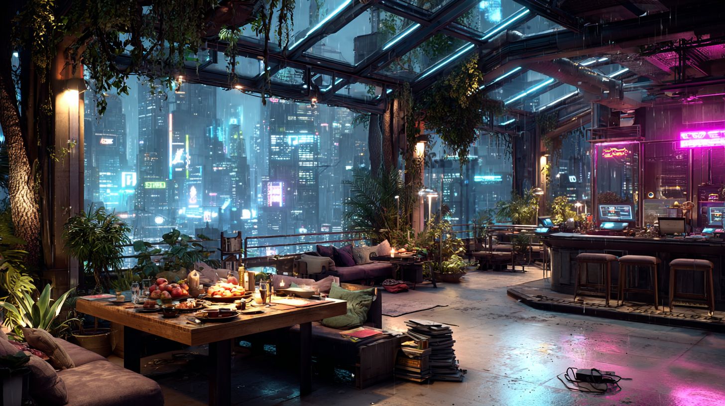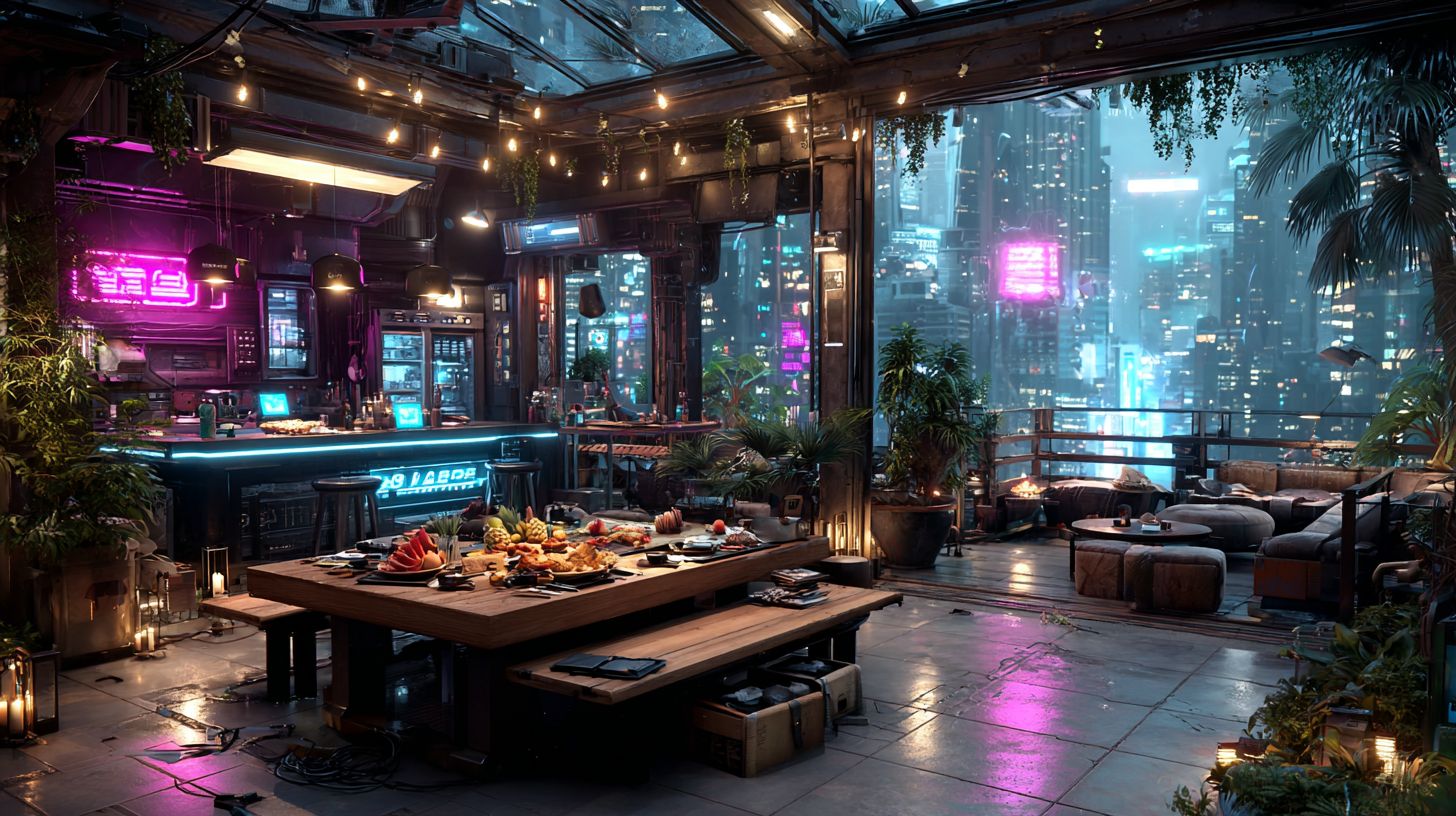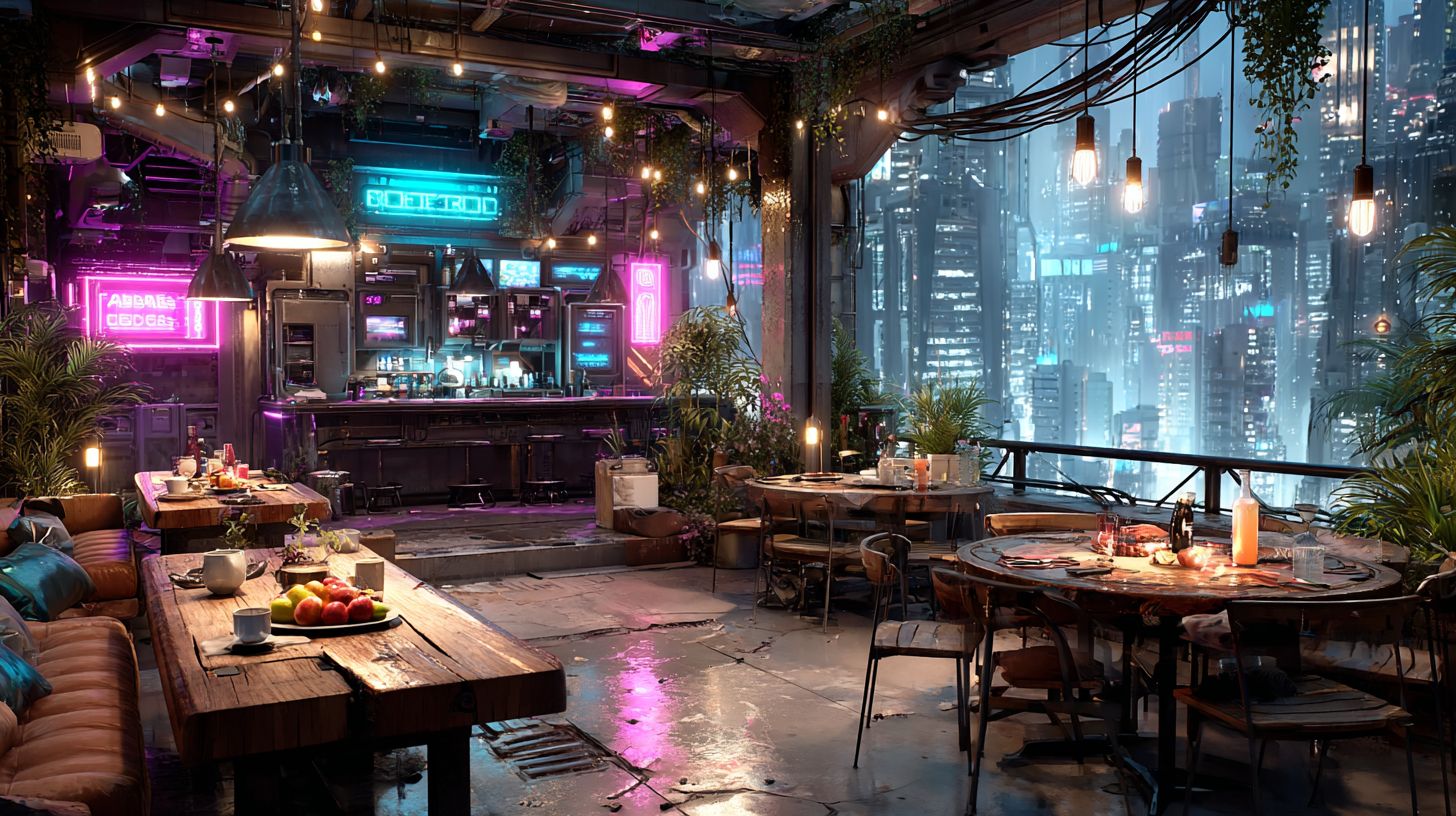 Prompt:in the style of cyberpunk 2077, neon-soaked futuristic dystopia, dense urban glow, electric magenta and cyan accents, cinematic high-contrast sci-fi atmosphere, a decadent rooftop bar above a cyberpunk city, overgrown plants on tables, glowing drinks, fruit plates, messy bottles, cables and small electronic junk scattered around, fog-drenched skyline beyond the balcony, flickering neon signage, layered urban depth, gritty sci-fi disorder, atmospheric perspective, cinematic composition, reflective surfaces, rich texture detail –no pristine luxury, empty scene, daylight, pastoral scenery –ar 16:9 –stylize 500 –chaos 25 –sref 2609119203 –v 7.0 –p qaczhqj